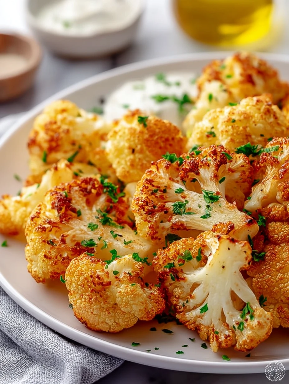 Once the cauliflower is cooked, I transfer it to a serving plate and top it with parsley. It is delicious as is, but I also love serving it with a creamy dip for extra flavor.