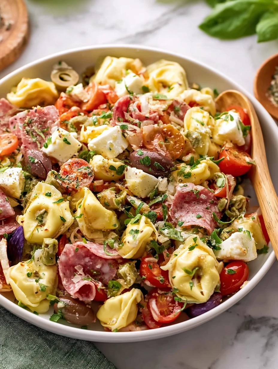 I think this dish works so well because it layers so many textures and flavors into one easy bowl. The tortellini gives it a soft, cheesy base, while salami adds a meaty bite. Cherry tomatoes bring sweetness, olives add briny depth, mozzarella keeps it creamy, and herbs wake the whole thing up.