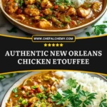 Authentic New Orleans Chicken Etouffee is the kind of easy dinner that feels rich, soulful, and deeply comforting from the very first bite. Tender chicken simmers in a bold Cajun-inspired gravy made with butter, flour, onion, celery, bell pepper, garlic, and broth, then gets spooned over fluffy rice for a classic Southern-style meal. This easy recipe is perfect for dinner ideas, family meals, cozy comfort food nights, and anyone looking for a hearty chicken and rice dish packed with Louisiana flavor.
