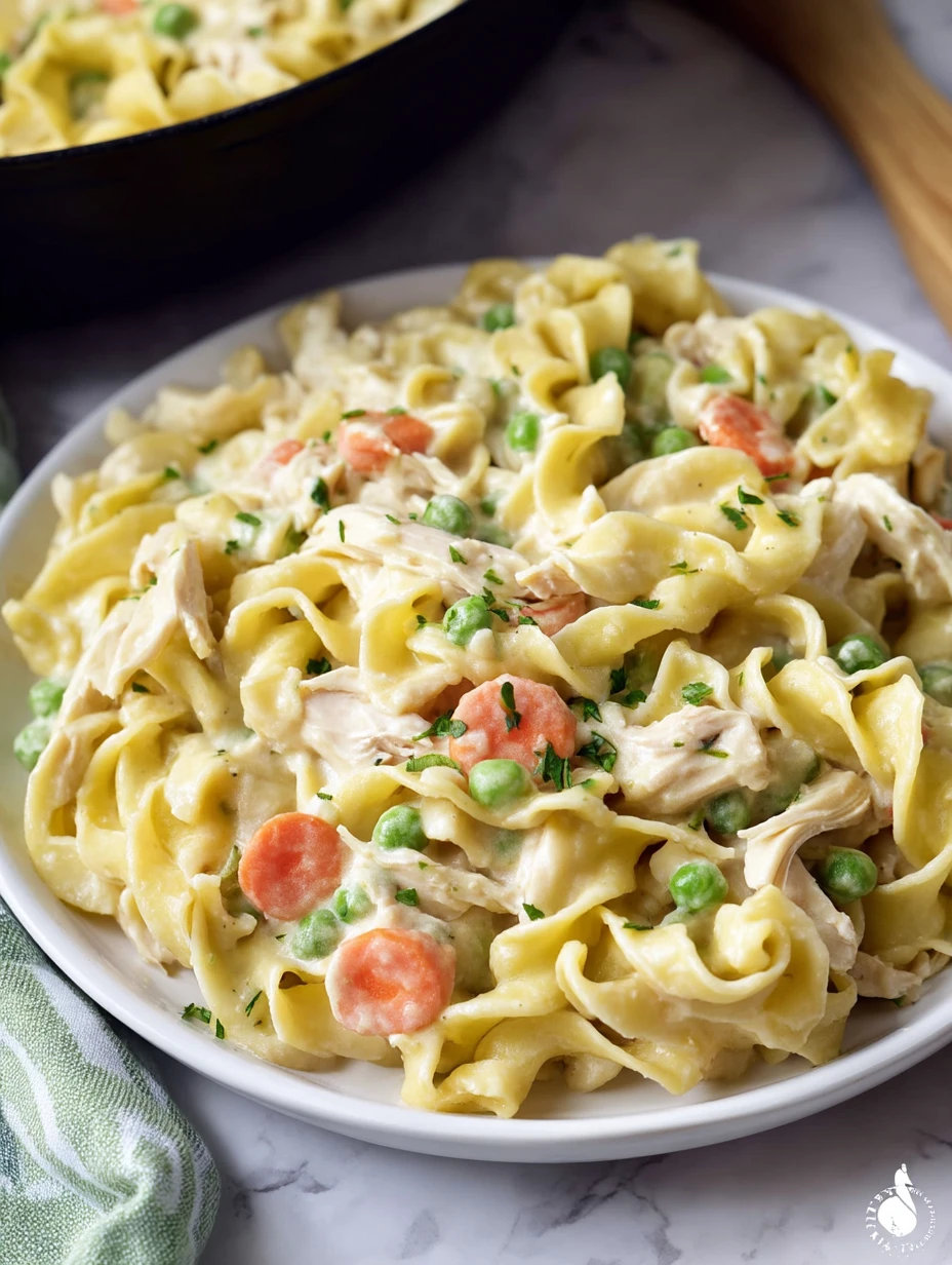 Keywords: chicken noodles, comfort food, easy dinner, chicken pot pie pasta