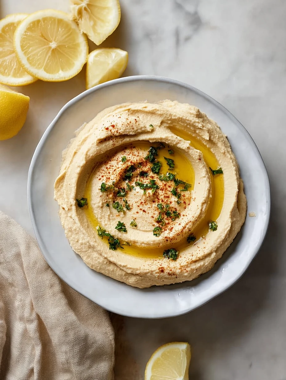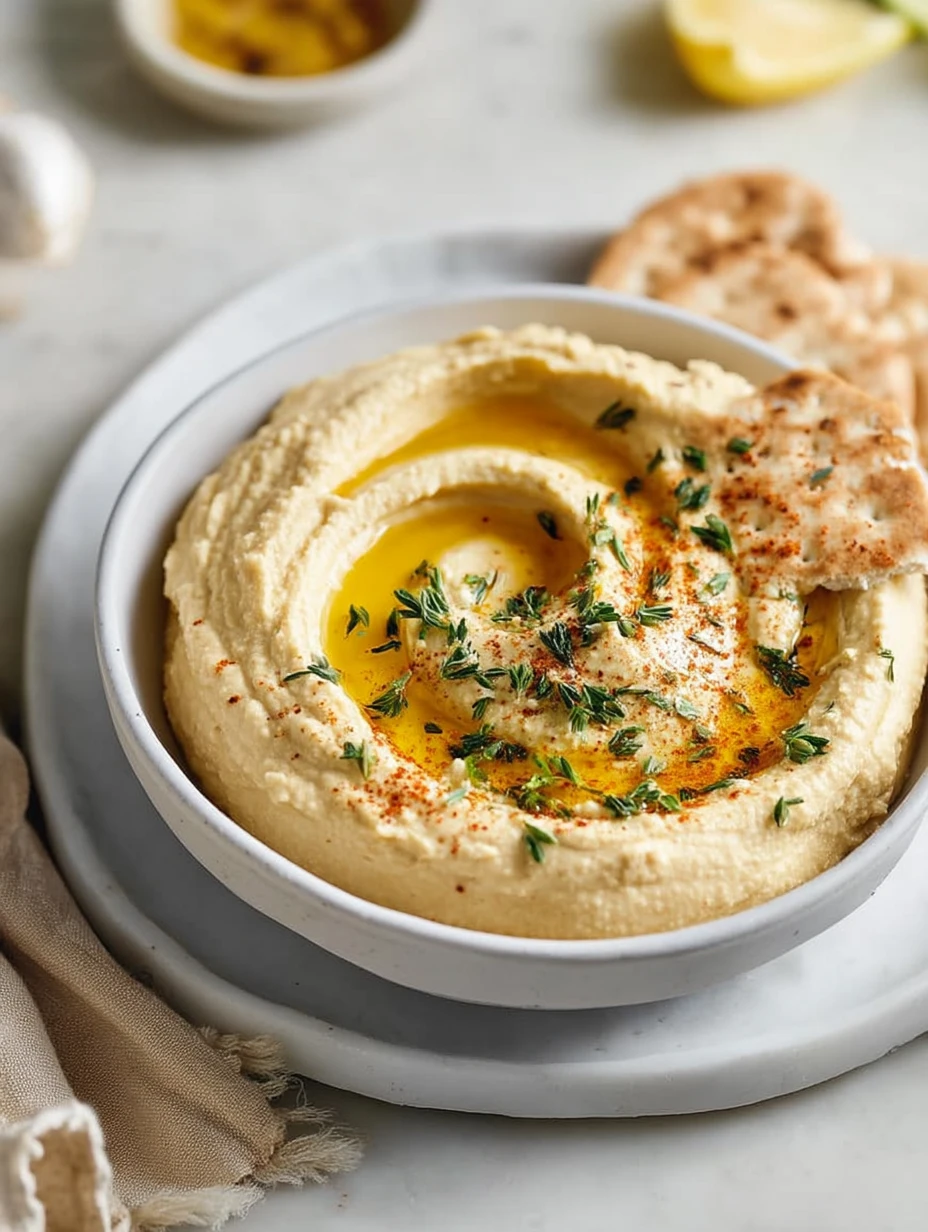Freshly made hummus can be served immediately at room temperature or chilled for a firmer texture. Store it in an airtight container in the fridge for up to 5 days. If it thickens over time, simply stir in a splash of water or olive oil before serving.