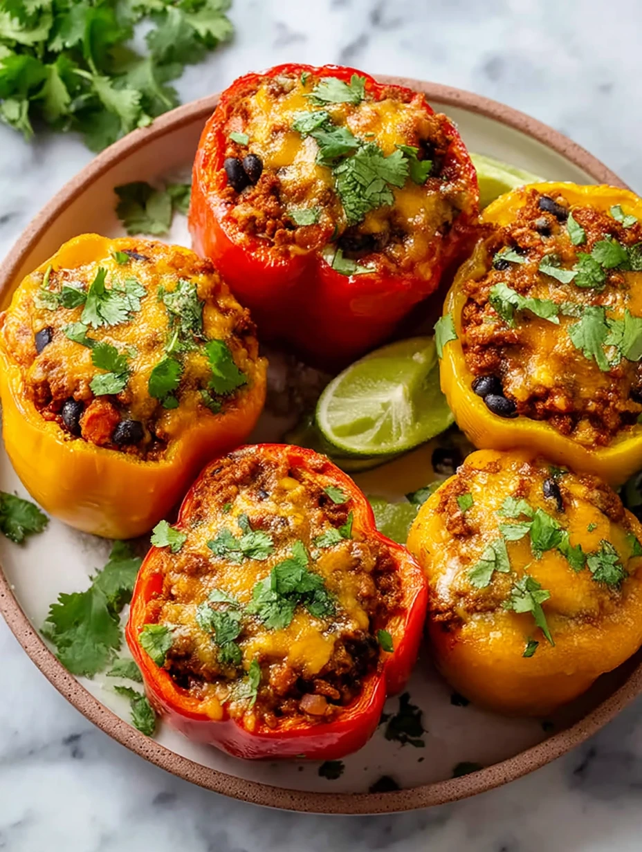 Just like tacos, these stuffed peppers love toppings. Dollop on a little Greek yogurt or sour cream, scatter some sliced green onions, or add pickled jalapeños if you want to dial up the heat. A bit of crumbled cotija cheese on top is never a bad idea either.