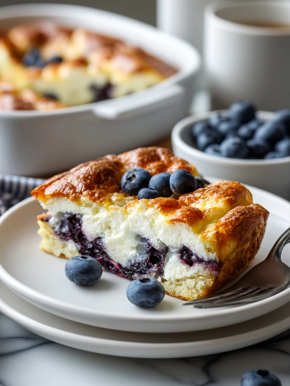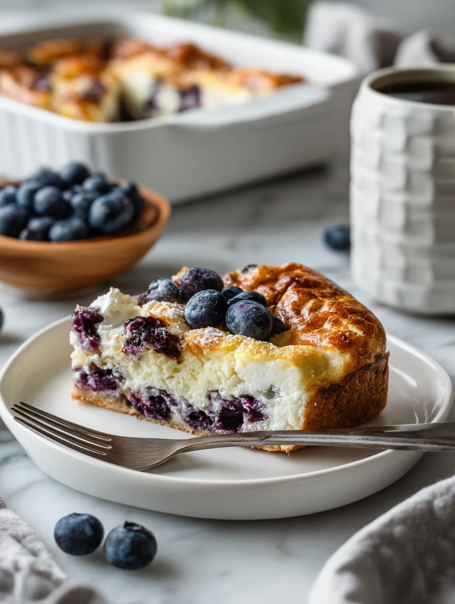 I reach for this bake when I want a breakfast that feels satisfying without being fussy. It is packed with creamy texture, gentle sweetness, and bright blueberry flavor, and it slices neatly once cooled a bit. That makes it great for breakfast at home, easy brunch entertaining, or storing in the fridge for the next morning.