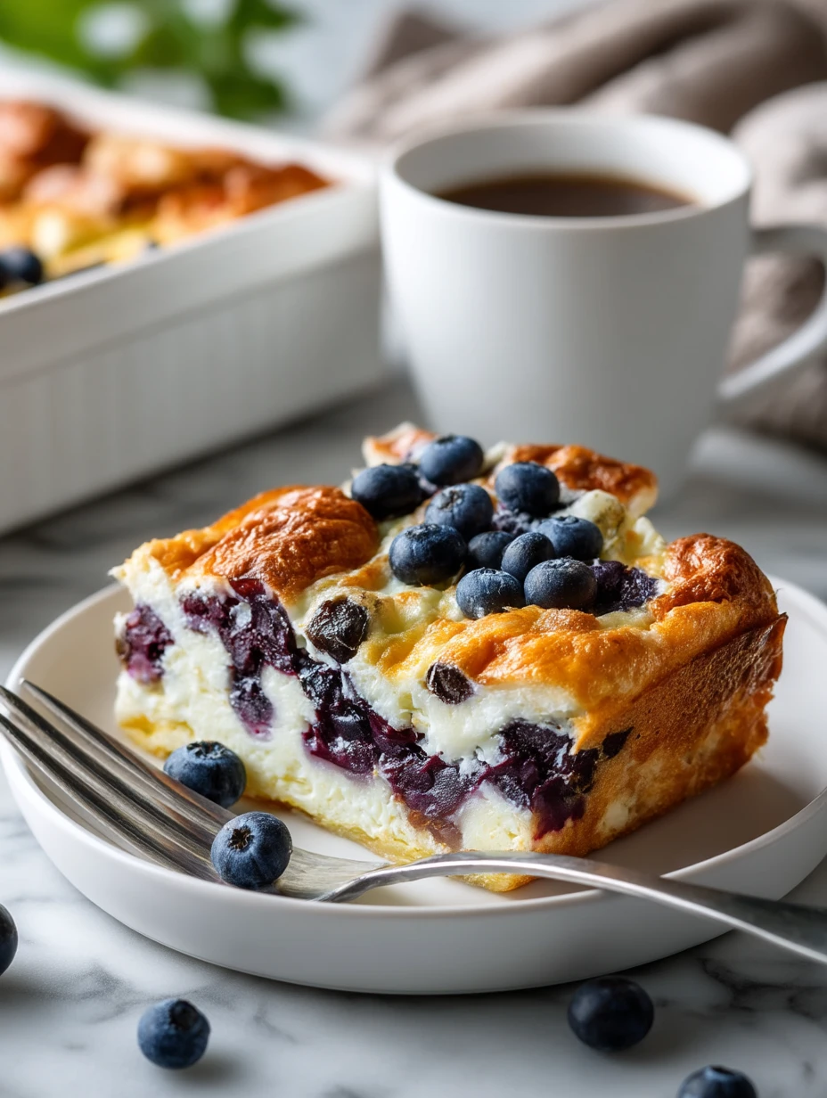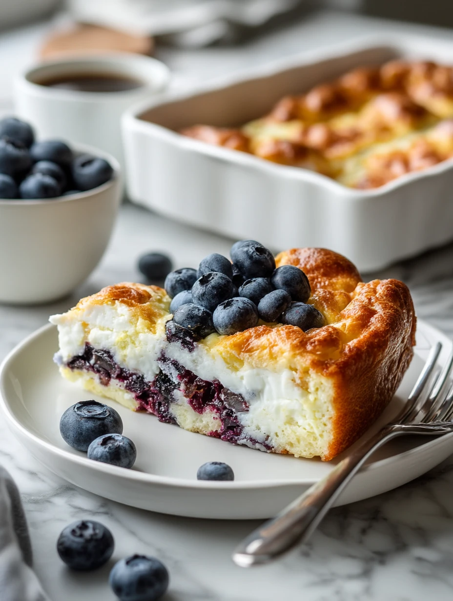 I like serving this bake slightly warm with a few extra fresh blueberries on top. A light dusting of powdered sugar is lovely if I want it to feel more brunch-worthy, and a spoonful of yogurt on the side makes it even creamier. It is just as good cold from the fridge, which is why I often make it ahead for the next morning.