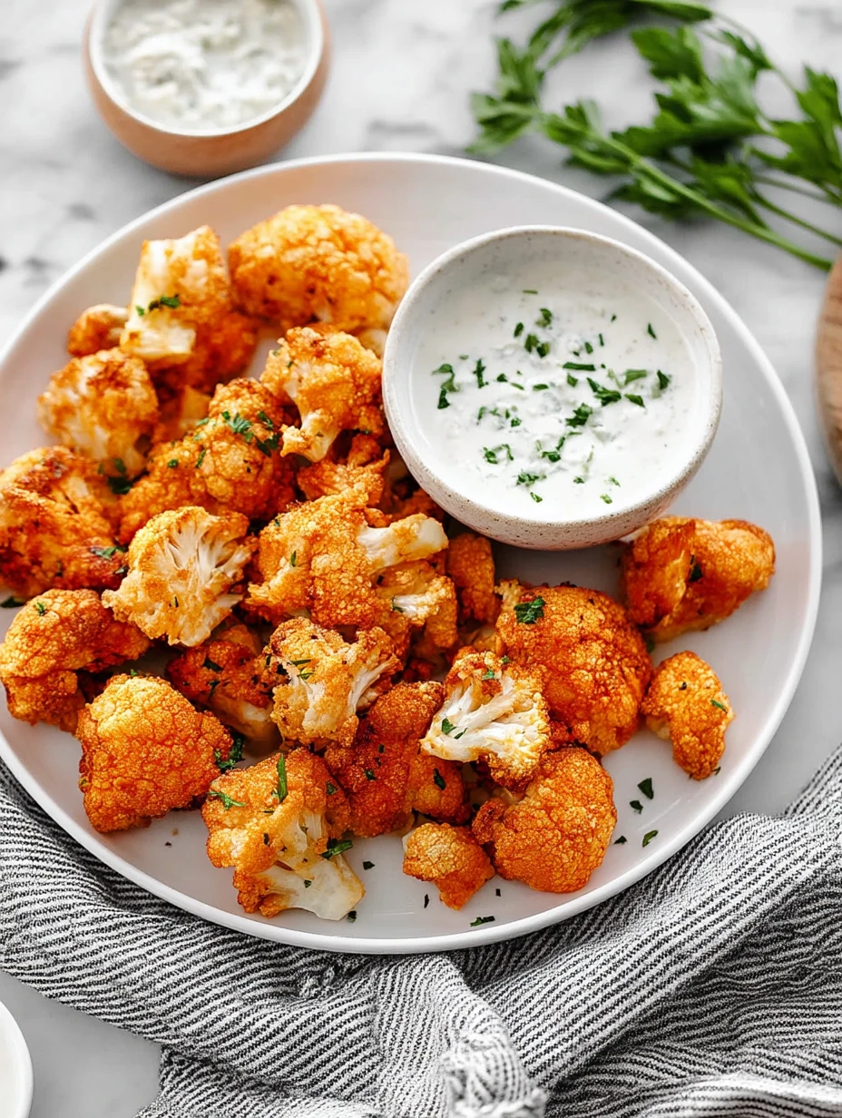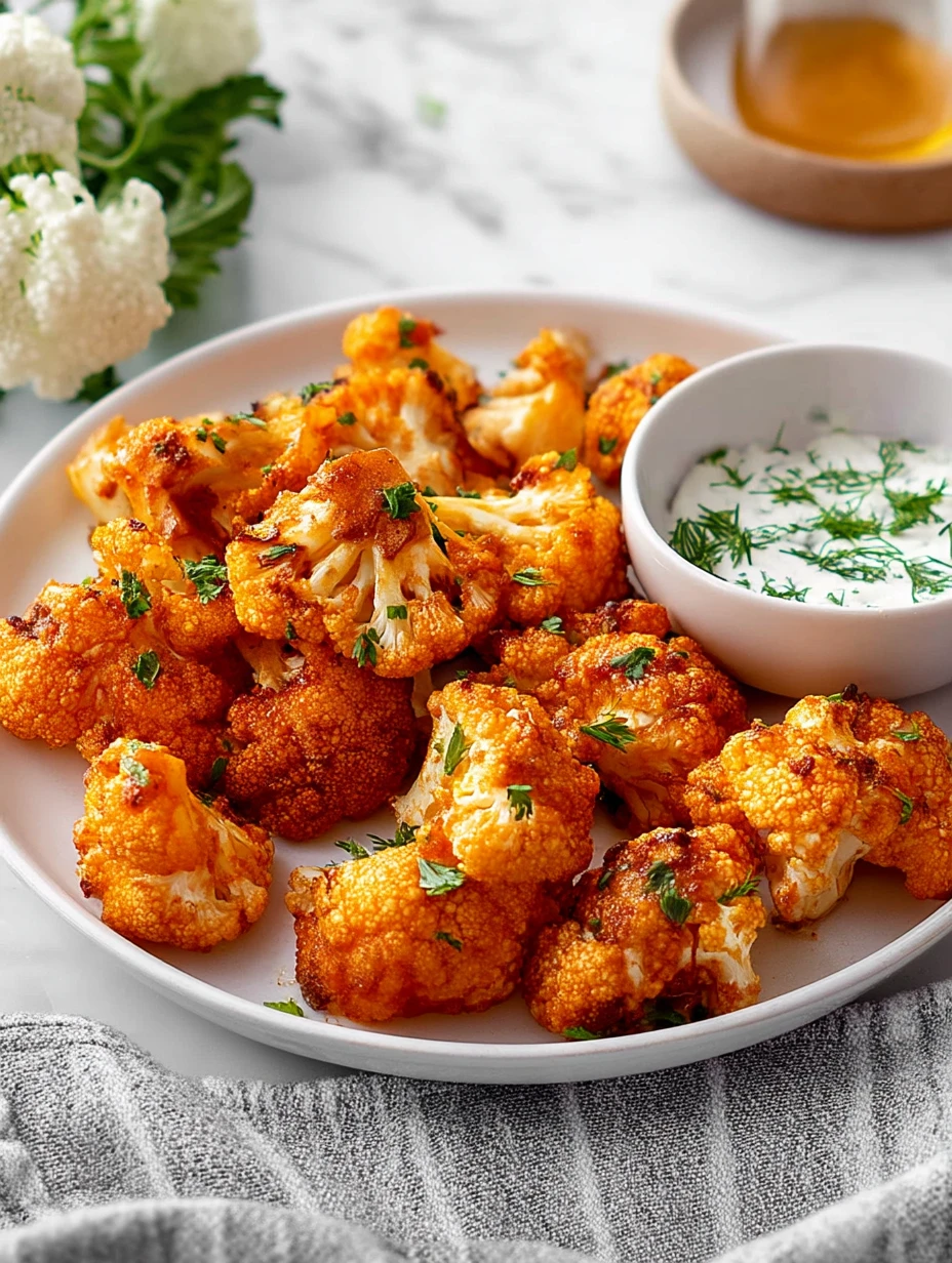 Arrange the Buffalo Cauliflower Bites on a platter with your favorite creamy dip in the center. Scatter fresh herbs over the top and serve immediately while they’re hot and crisp.
