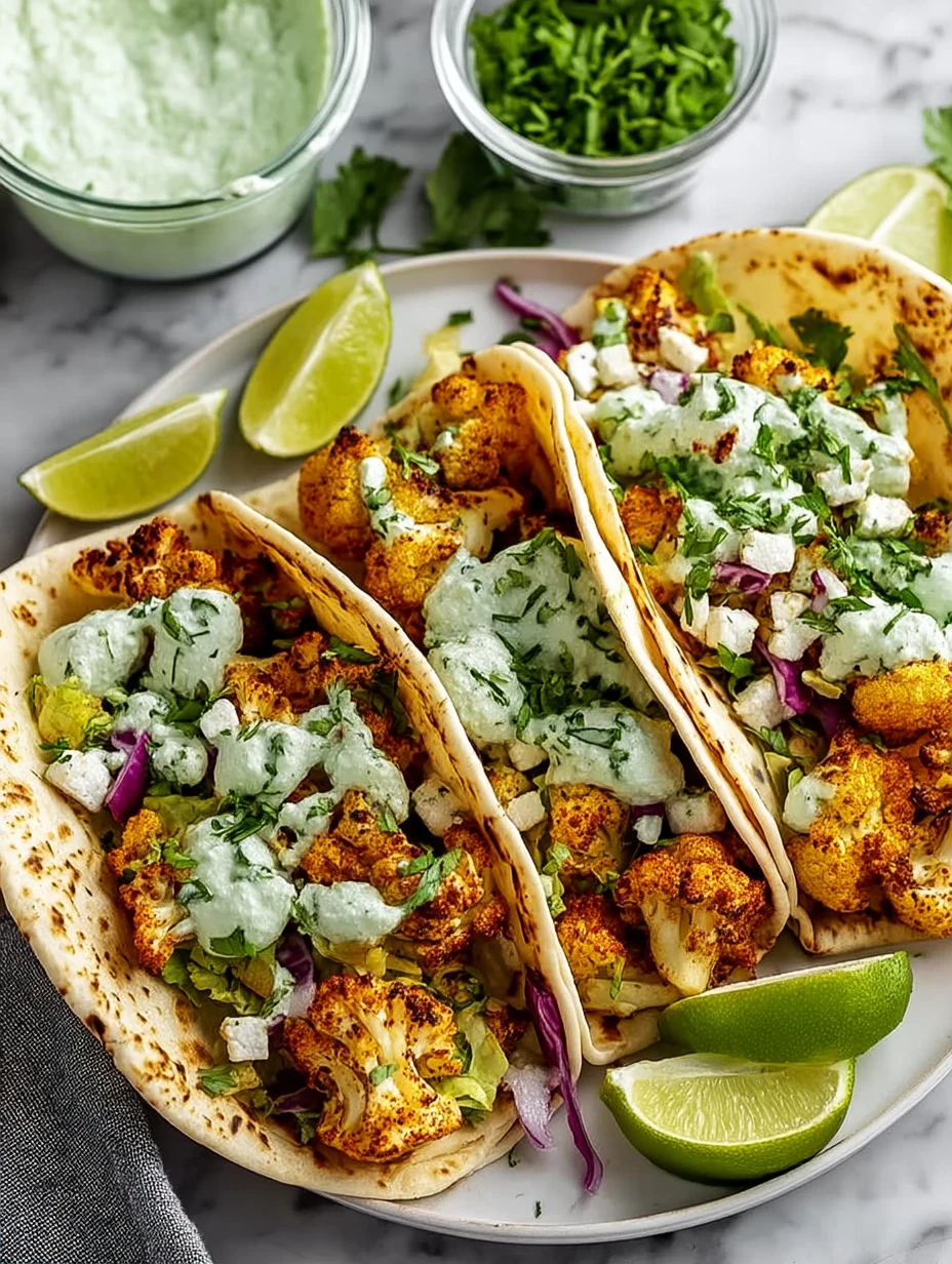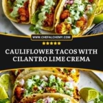 Keywords: cauliflower tacos, cilantro lime crema, vegetarian tacos, easy dinner, taco recipe, roasted cauliflower, healthy dinner ideas, food ideas, quick dinner