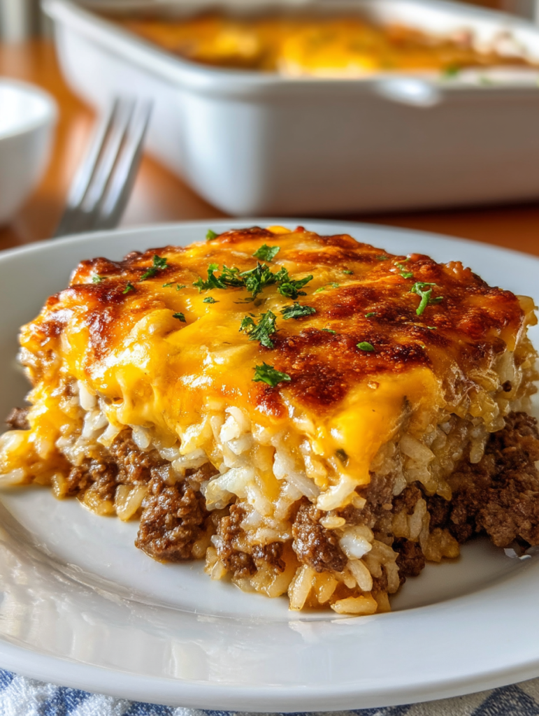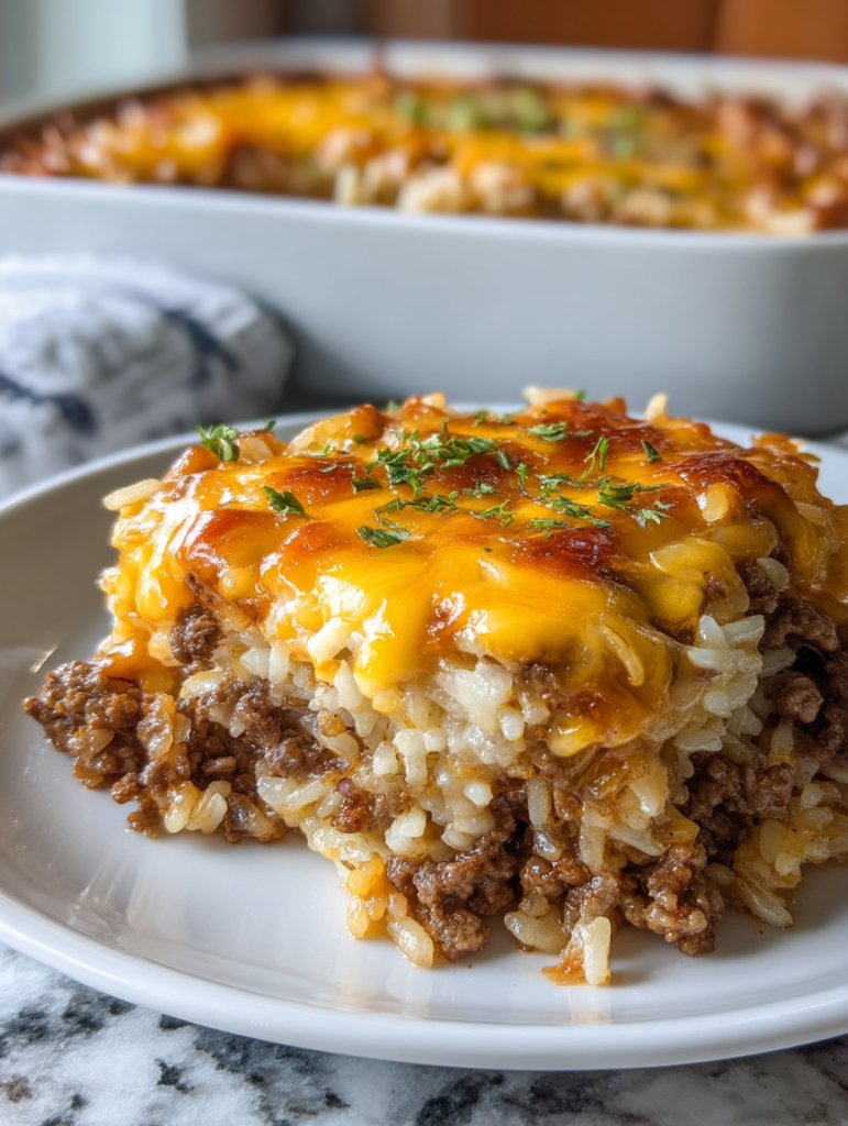 Imagine biting into a golden crust of bubbling cheddar only to discover creamy, cheesy rice and perfectly seasoned beef underneath. It’s warm, filling, and endlessly satisfying. Best of all, this recipe is quick to assemble and bakes beautifully, making it perfect for busy evenings or potluck gatherings.