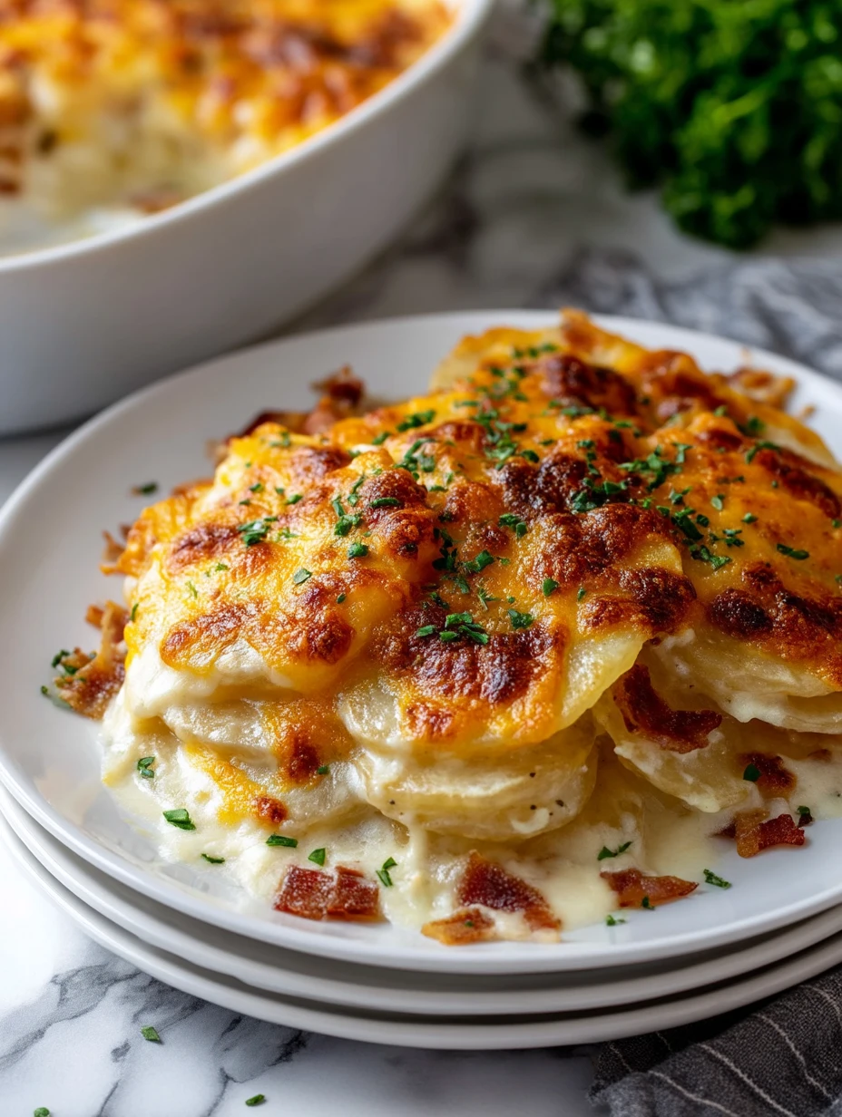 Creamy, bubbling, and loaded with cheese and crispy bacon, these Cheesy Potatoes Au Gratin are the side dish that always steals the show. Thinly sliced potatoes bake in a rich garlic cream sauce until fork-tender, then get blanketed with melted cheddar, Gruyère, and a golden Parmesan crust. It’s a cozy casserole that works for holiday dinner ideas, Sunday suppers, or whenever you’re craving comforting food ideas. Serve it with your favorite easy dinner mains, keep leftovers for a quick breakfast or hearty lunch, and enjoy an easy recipe that fits right into your list of breakfast ideas, dinner ideas, and even not-so-healthy snack dreams.