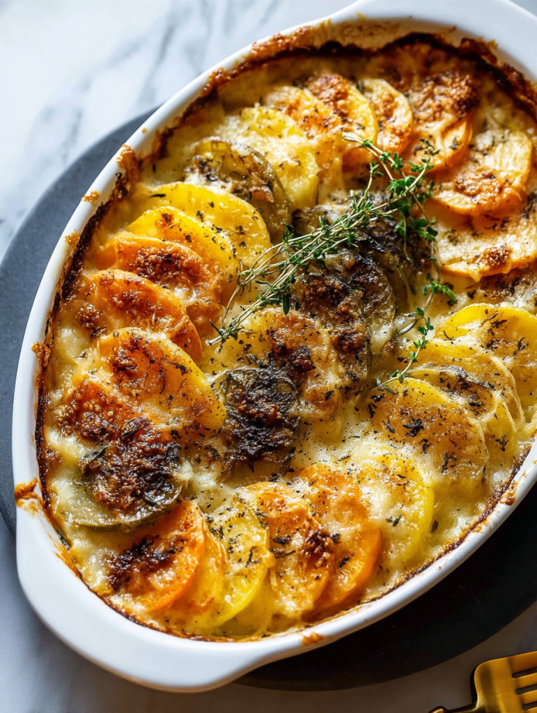 Golden layers of Yukon gold potatoes, sweet potatoes, carrots, and golden beets baked in rich cream and bubbling cheese—this Cheesy Root Veggie Gratin is the cozy side dish your dinner table has been craving. Whether you’re making it for a holiday or just need new dinner ideas, it checks all the boxes for easy recipe, crowd-pleasing food ideas, and beautiful presentation. It’s hearty, vegetarian-friendly, and the perfect blend of earthy root veggies and indulgent creamy texture. Ideal as a healthy snack alternative or a quick side for a comforting dinner idea.