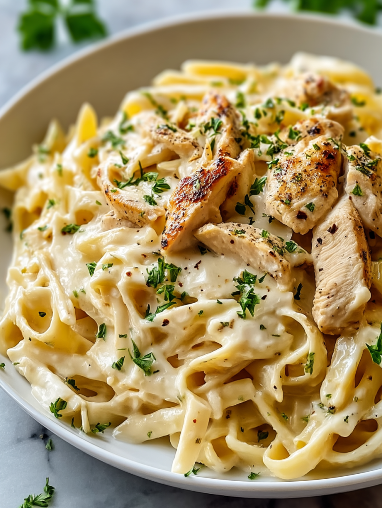 What sets this Alfredo apart is the balance of richness and seasoning. The sauce is luscious with heavy cream, butter, garlic, and parmesan, yet it’s lightened by a touch of pepper and fresh parsley. The golden seared chicken slices add that irresistible texture and protein boost that turns this pasta into a main course you’ll crave on repeat.