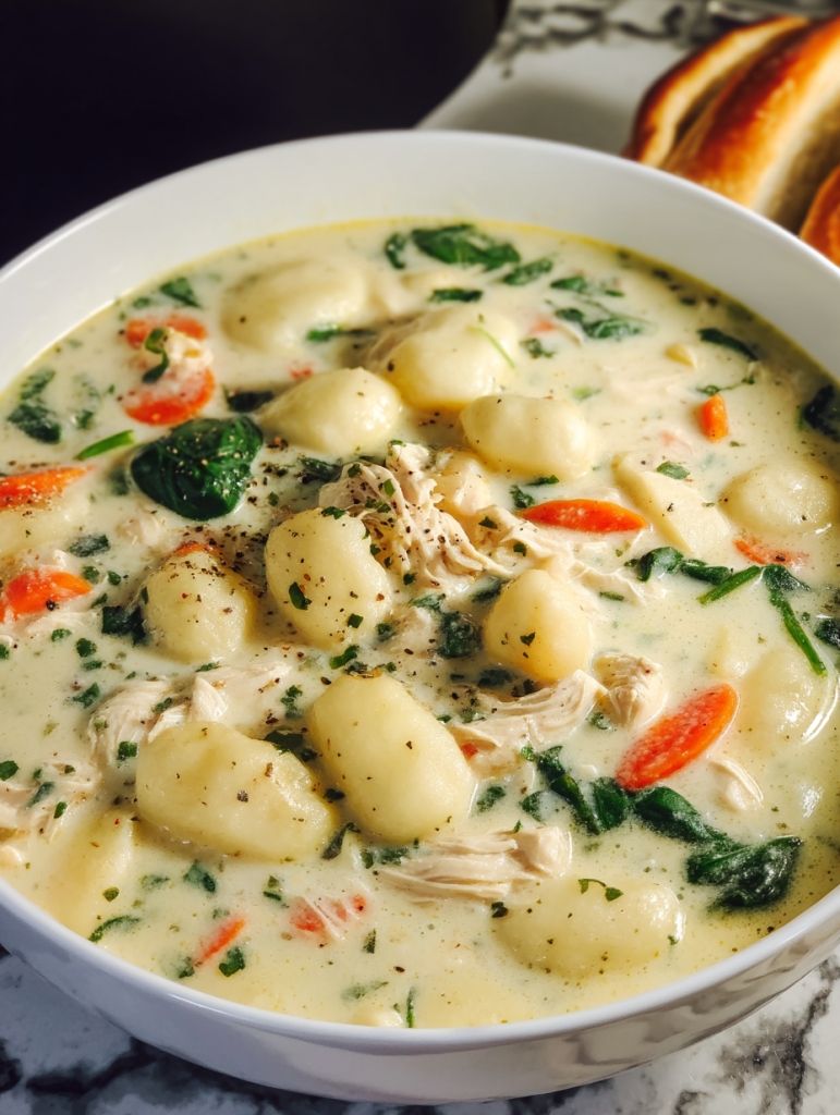 Chicken Gnocchi Soup is best served hot right after cooking, when the gnocchi are still perfectly pillowy and the creamy broth is silky smooth. Garnish with extra black pepper or even a sprinkle of grated Parmesan for a savory touch. A slice of crusty bread or a soft dinner roll turns this soup into a complete comfort meal.