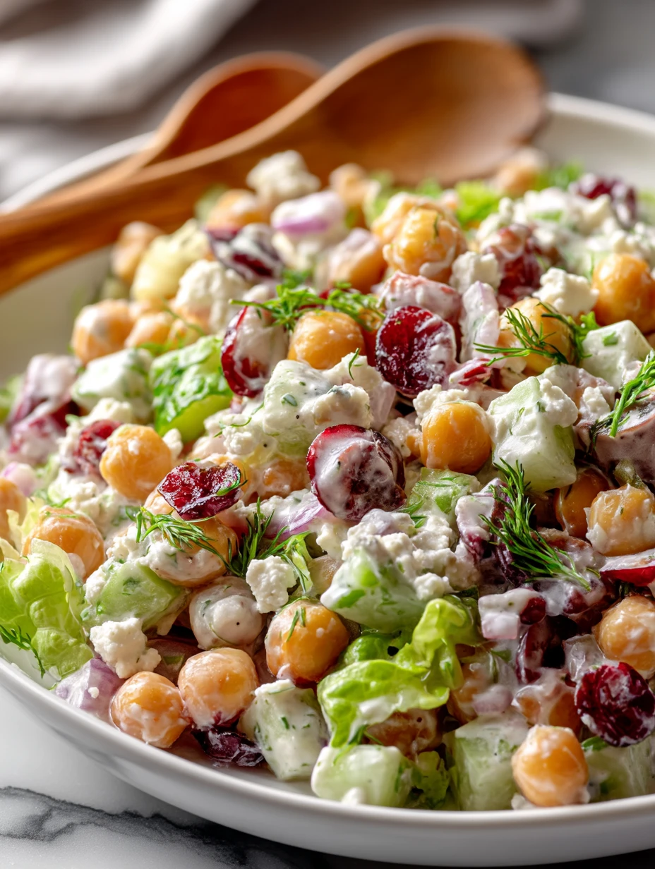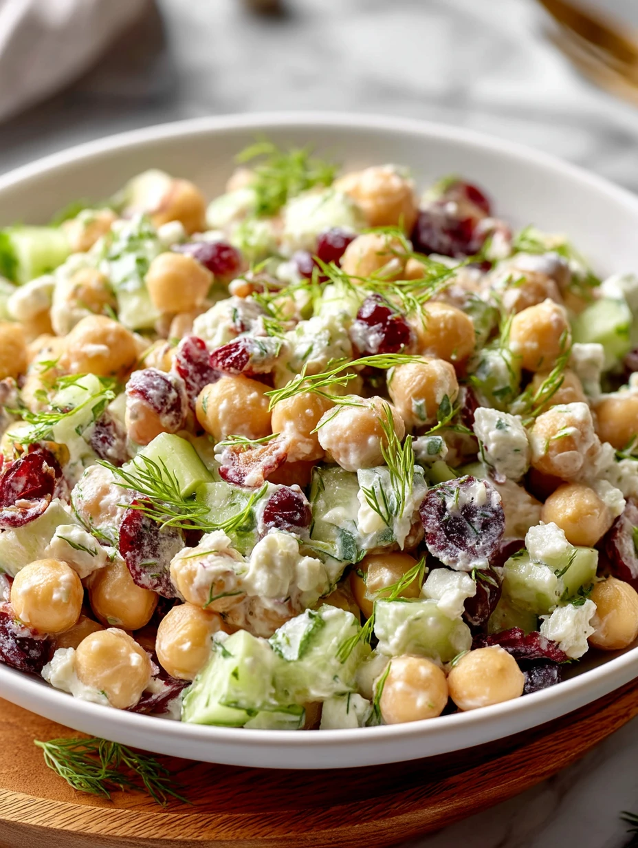 Keywords: chickpea salad, cranberry salad, creamy feta dressing, healthy lunch, easy salad recipe, vegetarian dinner, meal prep salad, high protein salad, quick dinner, healthy snack, salad ideas