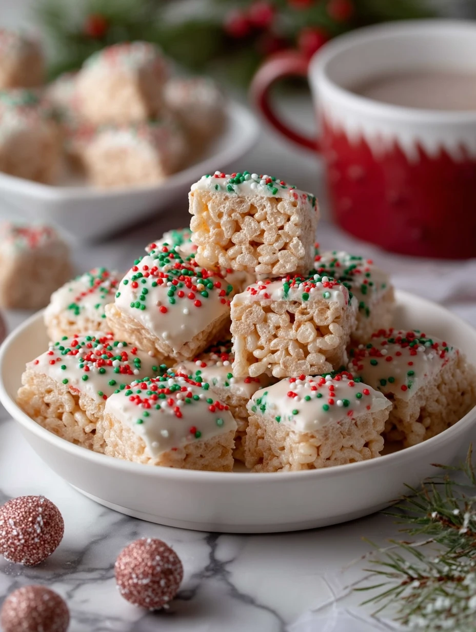 Christmas Rice Crispy Treats With Sprinkles are the kind of easy dessert that instantly makes a holiday table feel more festive. These no-bake treats are made with buttery marshmallows, crispy rice cereal, and a smooth white chocolate coating, then finished with red, green, and white sprinkles for the perfect Christmas touch. They are ideal for holiday parties, cookie trays, easy dessert ideas, sweet snacks, and fun food ideas when you want something cute, quick, and crowd-pleasing without a lot of work.