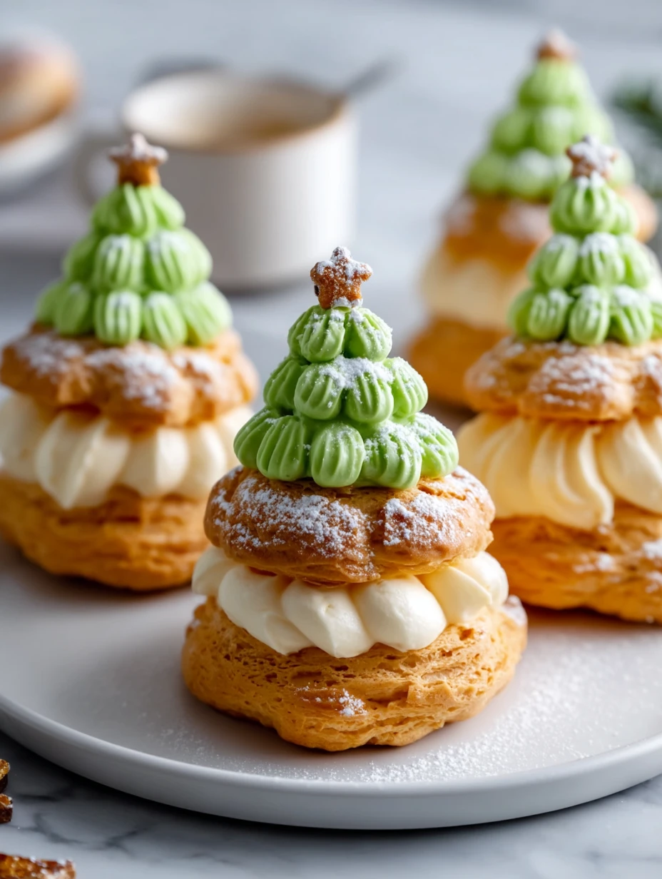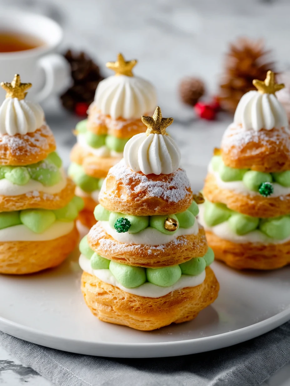 Bring the magic of the holidays to your dessert table with these enchanting Christmas Tree Cream Puffs. A whimsical twist on classic French choux pastry, these festive delights are stacked into tree-like towers and filled with fluffy, tinted whipped cream or pastry cream. Each puff is topped with a charming cookie star and a dusting of powdered sugar for a snowy finish.