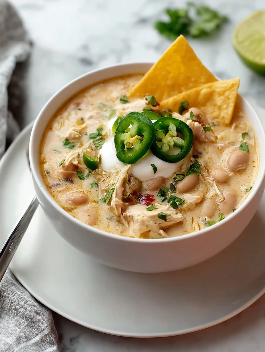 Keywords: creamy chili, chicken chili, white chicken chili, quick dinner, one-pot meal