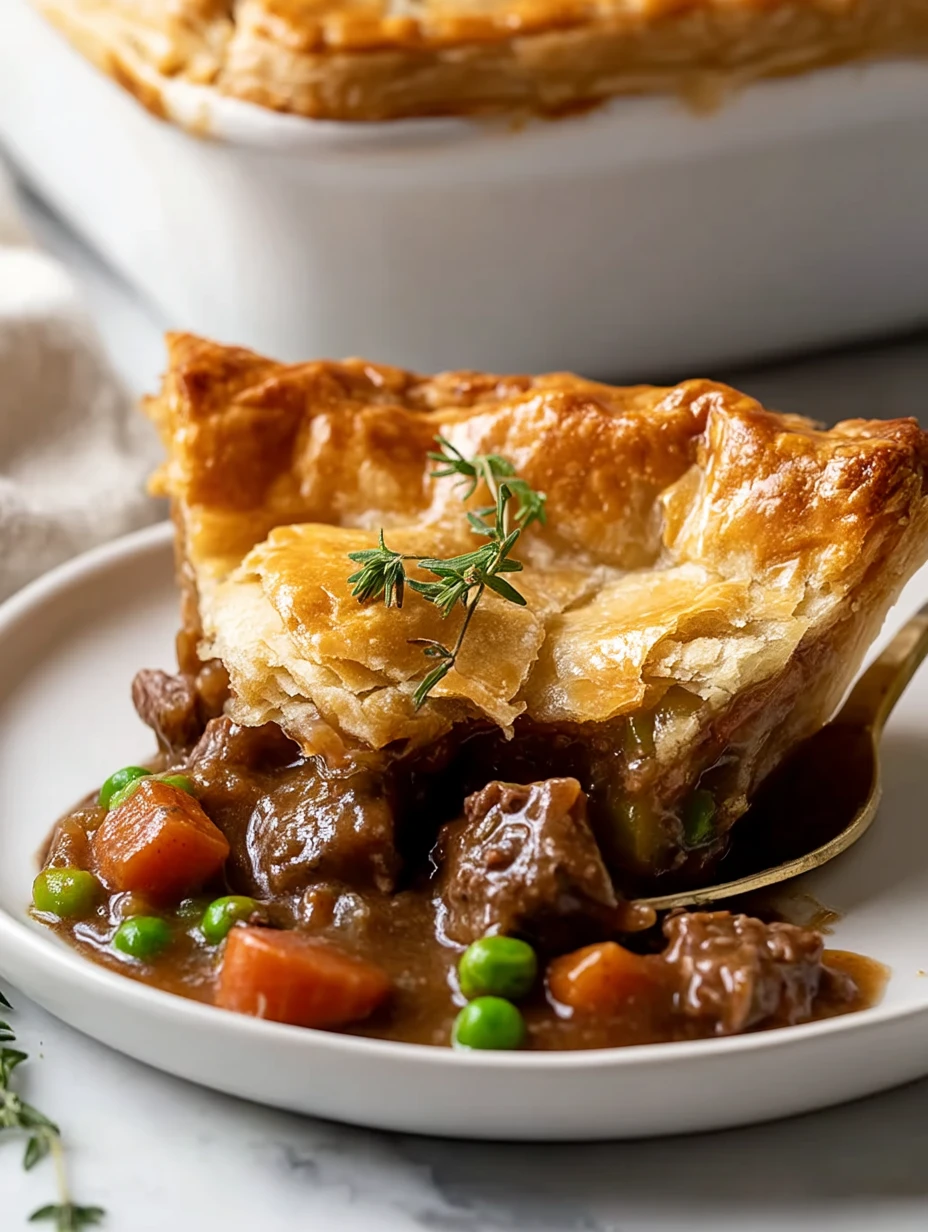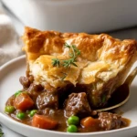 Golden, flaky puff pastry meets hearty, slow-simmered beef stew in this irresistible Classic Beef Pot Pie. Every spoonful is rich with savory depth—tender beef chunks, sweet peas, and carrots all bathed in a glossy gravy and nestled beneath a blanket of buttery crust. This dish is comfort food in its coziest form.