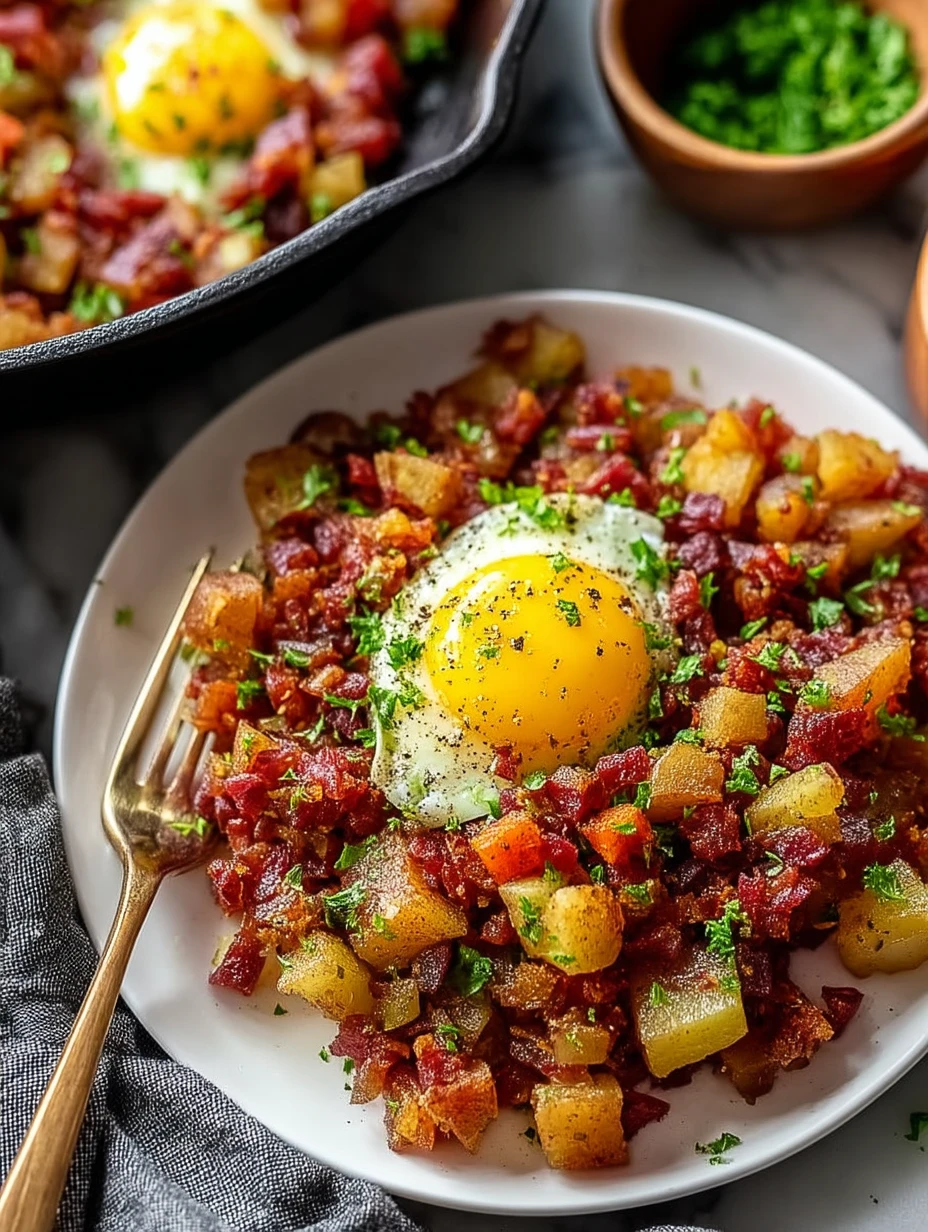 Corned beef hash is best served hot straight from the skillet, ideally with a fried egg on top for that runny yolk goodness. If you have leftovers, store them in an airtight container in the fridge for up to 3 days. Reheat in a skillet over medium heat to retain the crispy texture. Avoid microwaving, which softens the edges.