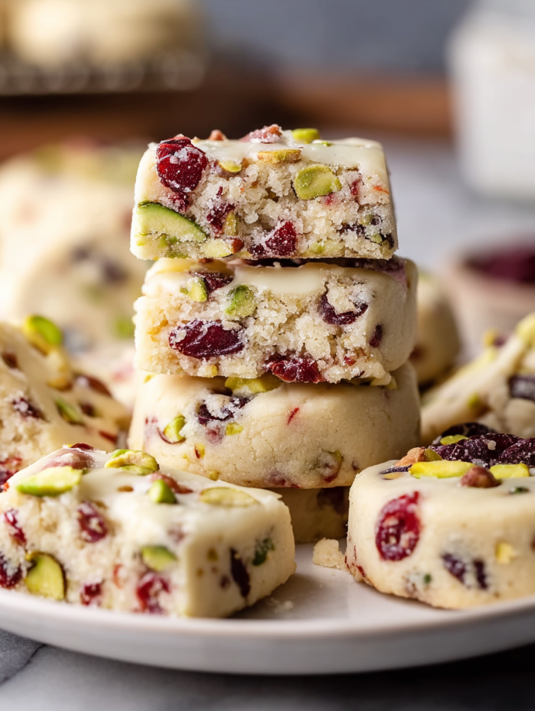 The shortbread base offers a buttery, tender texture that contrasts beautifully with the chew of cranberries and the crunch of pistachios. White chocolate on top elevates them into dessert territory, making them as gift-worthy as they are snackable. Unlike traditional round cookies, these are baked as bars—easier, less messy, and absolutely stunning.