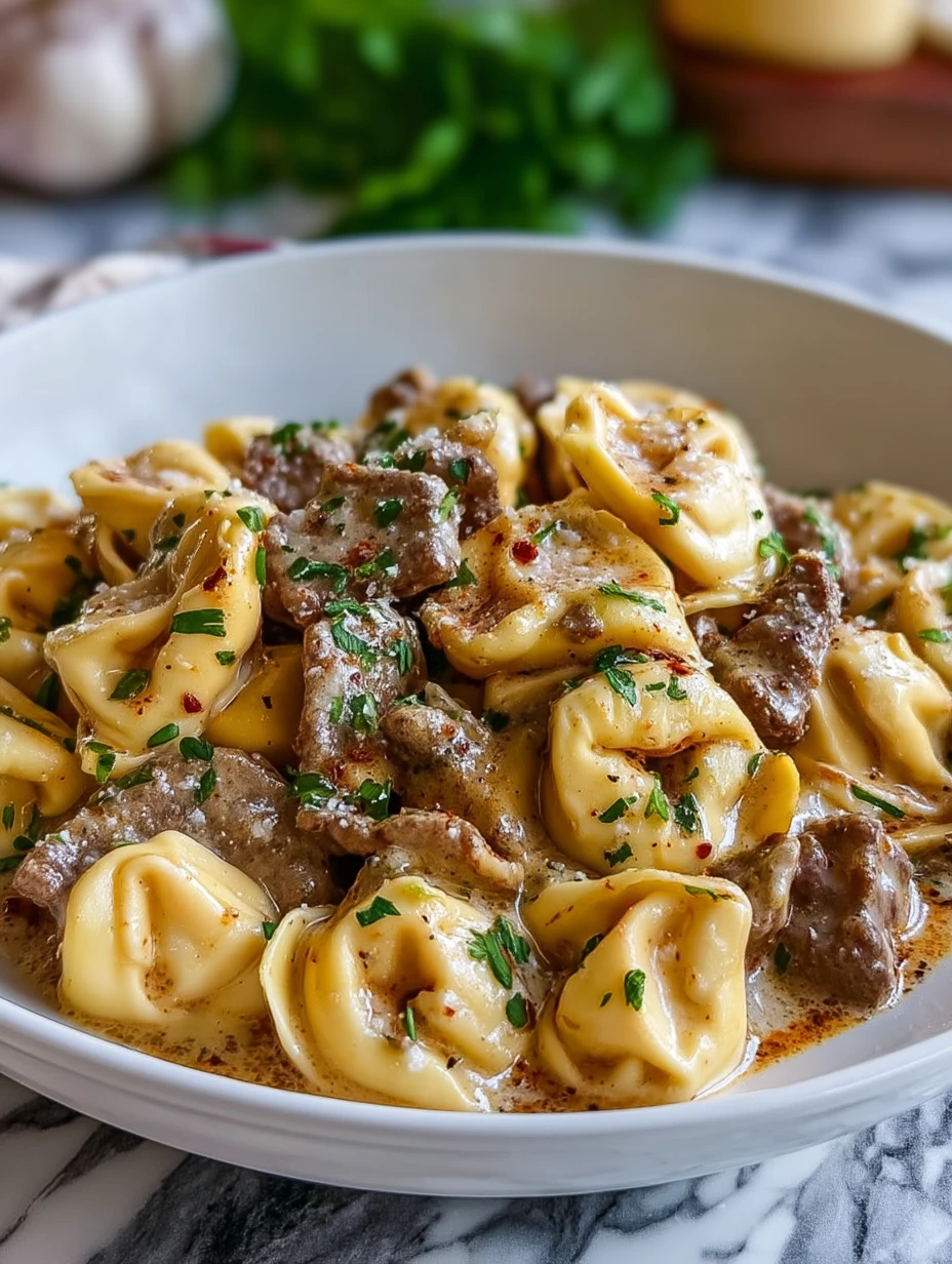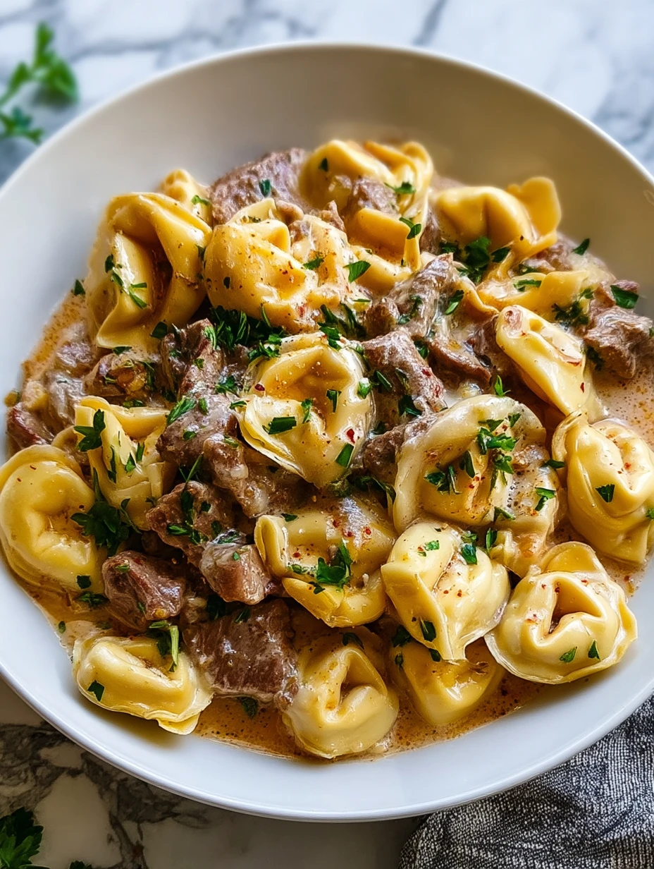 Whether you’re looking to impress guests or whip up a weeknight winner, this recipe makes it ridiculously easy to deliver big flavor without fuss. The steak sears quickly, the sauce thickens into cheesy perfection, and the tortellini cooks in minutes — a one-pan dream for any pasta and meat lover.