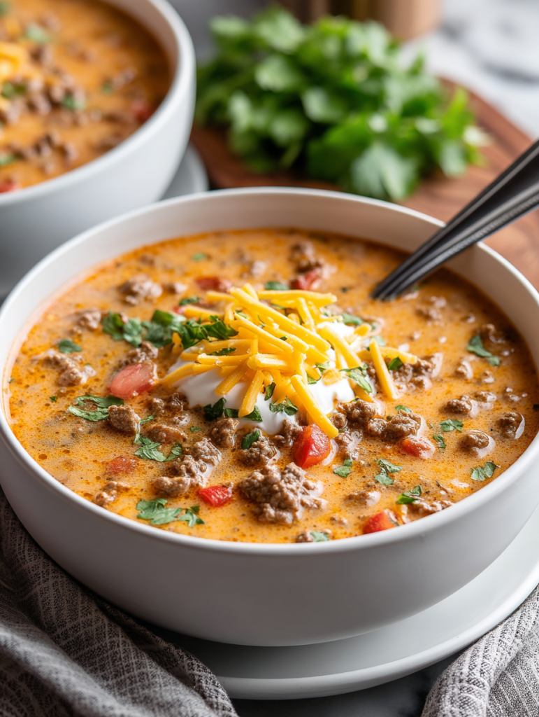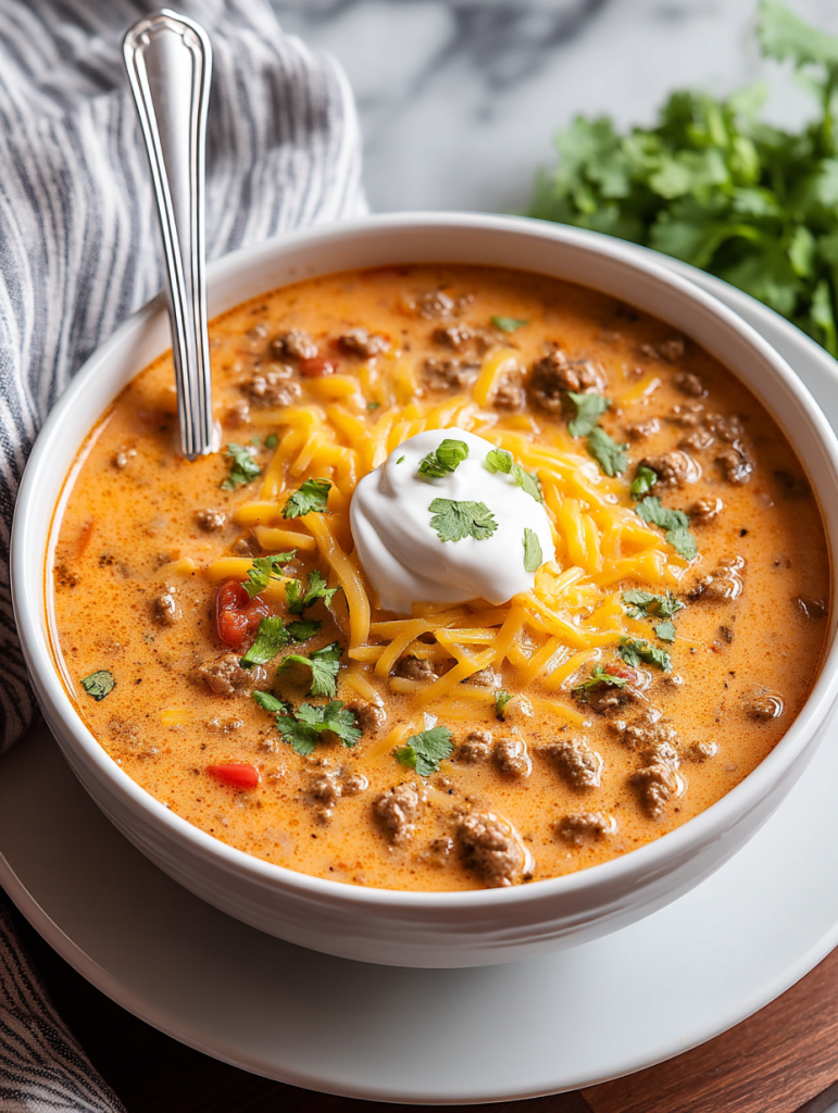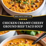 Warm, creamy, and loaded with flavor, this Creamy Cheesy Ground Beef Taco Soup is a one-pot meal you’ll crave again and again. With bold taco seasoning, rich ground beef, melty cheddar, and a luxurious cream cheese swirl, it’s everything you love about tacos—in a bowl. Perfect for quick dinners, easy comfort food, hearty soups, or family-friendly meals, this easy recipe will warm you up fast and keep everyone coming back for seconds. Great for meal prep, weeknight food ideas, or a last-minute dinner that feels like a treat.