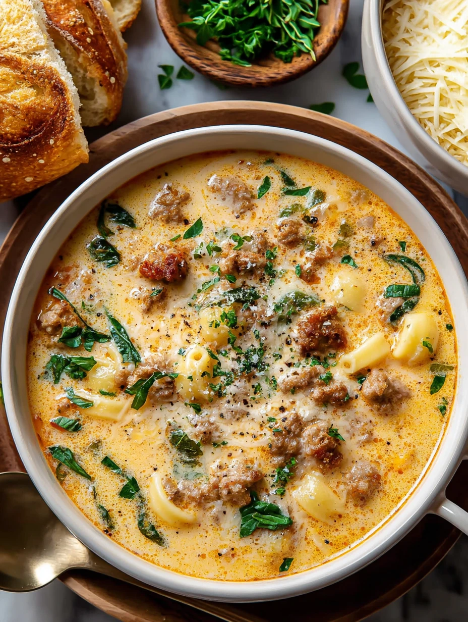 The base of this soup is a lush, creamy parmesan broth filled with crumbled Italian sausage, tender ditalini pasta, and golden chunks of potatoes. Each spoonful delivers a comforting medley of textures and flavors. The addition of garlic, onion, and fresh parsley lifts the richness with aromatic depth.