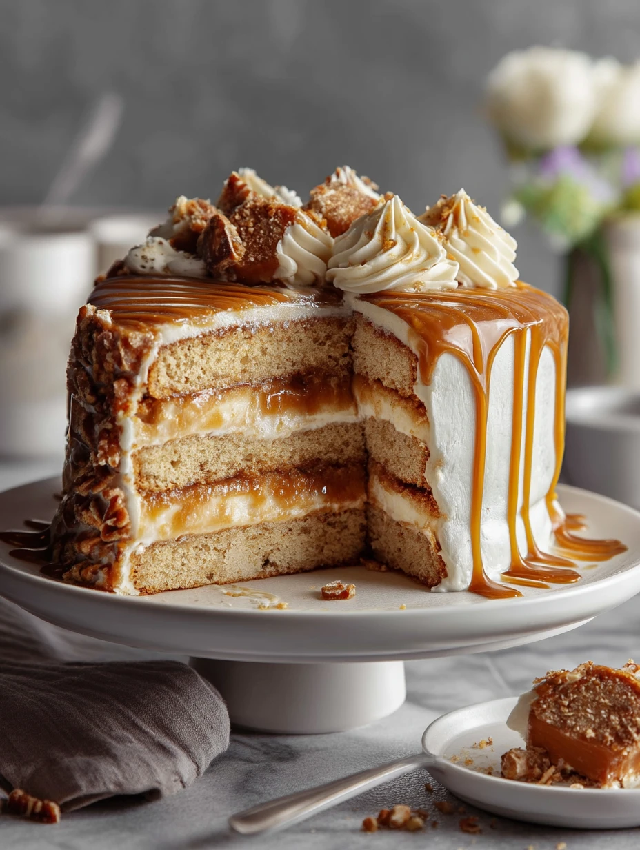 Toffee bits or chopped caramel candy add crunch on top and make the cake feel even more special.