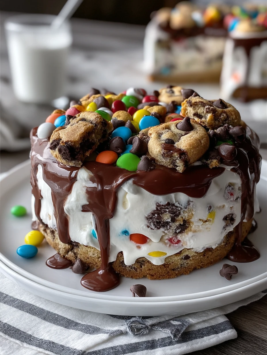If you’ve ever stared at the freezer case and wished those store‑bought ice cream cakes had just a little more personality, this one is for you. Thick, chewy chocolate chip cookie layers, swirls of candy‑studded vanilla ice cream, and a shiny chocolate drip that cascades down the sides and puddles onto the plate—this cake is unapologetically over the top.