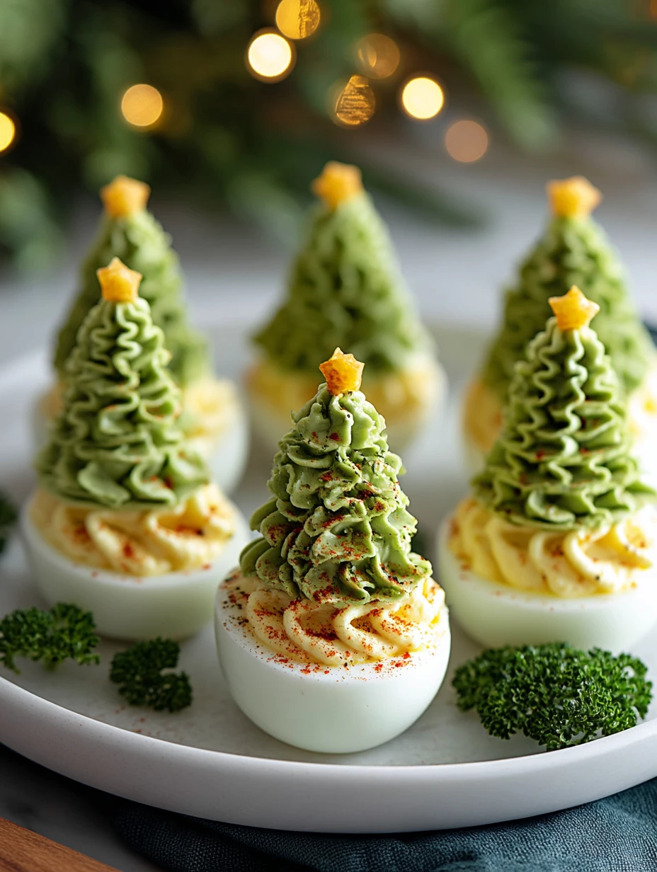 What I love most is how a familiar bite turns into something that feels special just by piping the filling high and decorating the top like a tiny Christmas tree. The green filling gives them a cheerful holiday look, while the rich egg yolks, creamy mayo, and a little tangy mustard keep the flavor comforting and familiar. They are the kind of Christmas snack that gets people smiling before they even take the first bite.