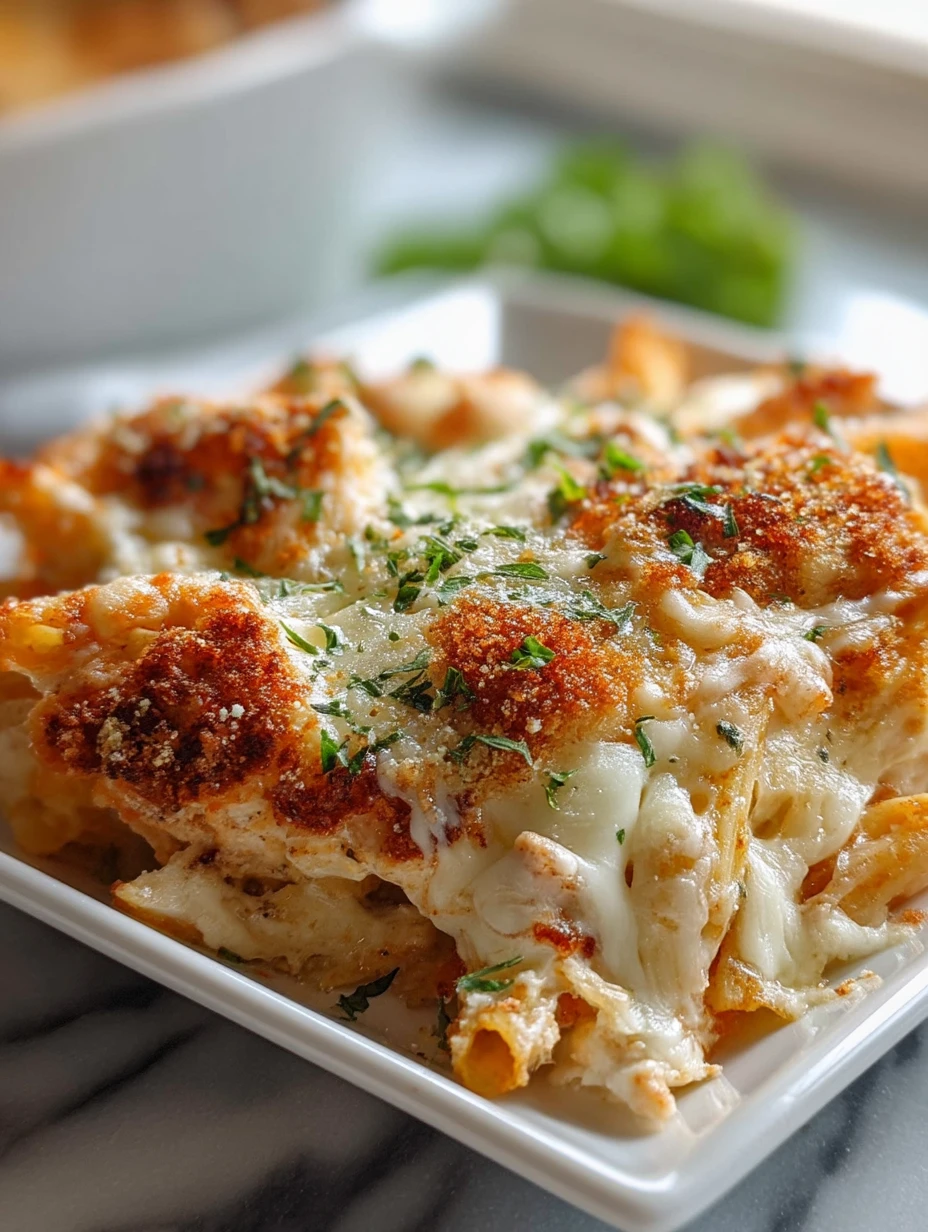 What comes out is creamy, saucy, cheesy, and bubbling around the edges, with tender pasta and juicy bites of chicken tucked under a golden Parmesan topping. It is the kind of meal I make on a busy weeknight when I still want something homemade, hearty, and satisfying enough to make everyone go back for seconds.