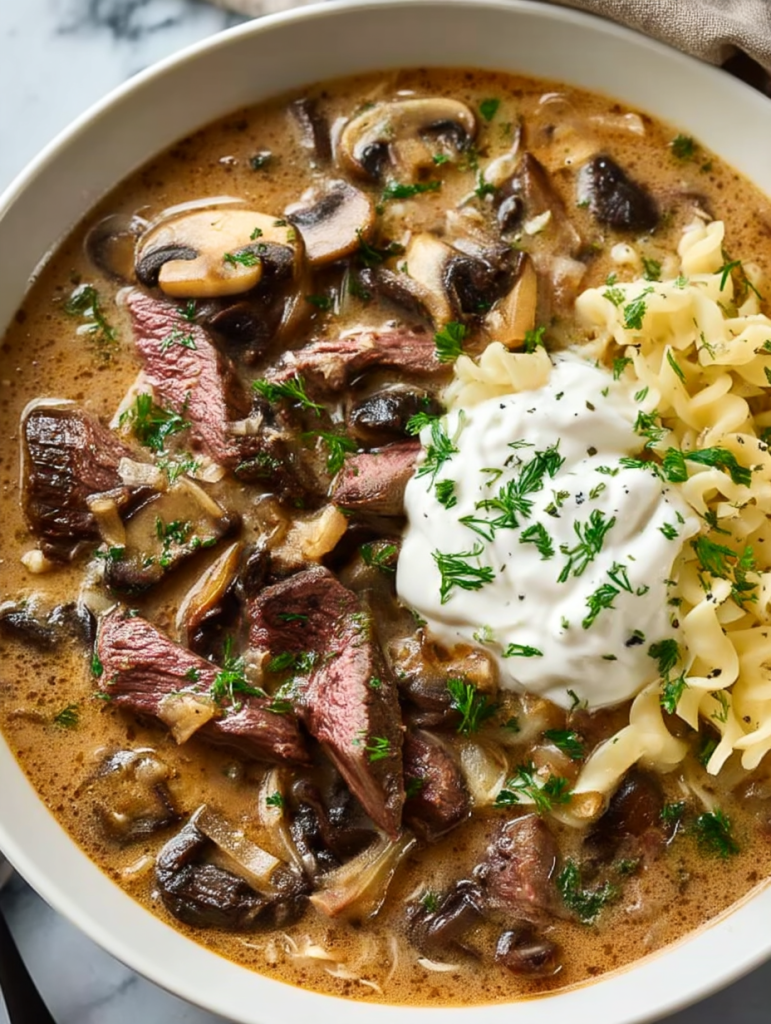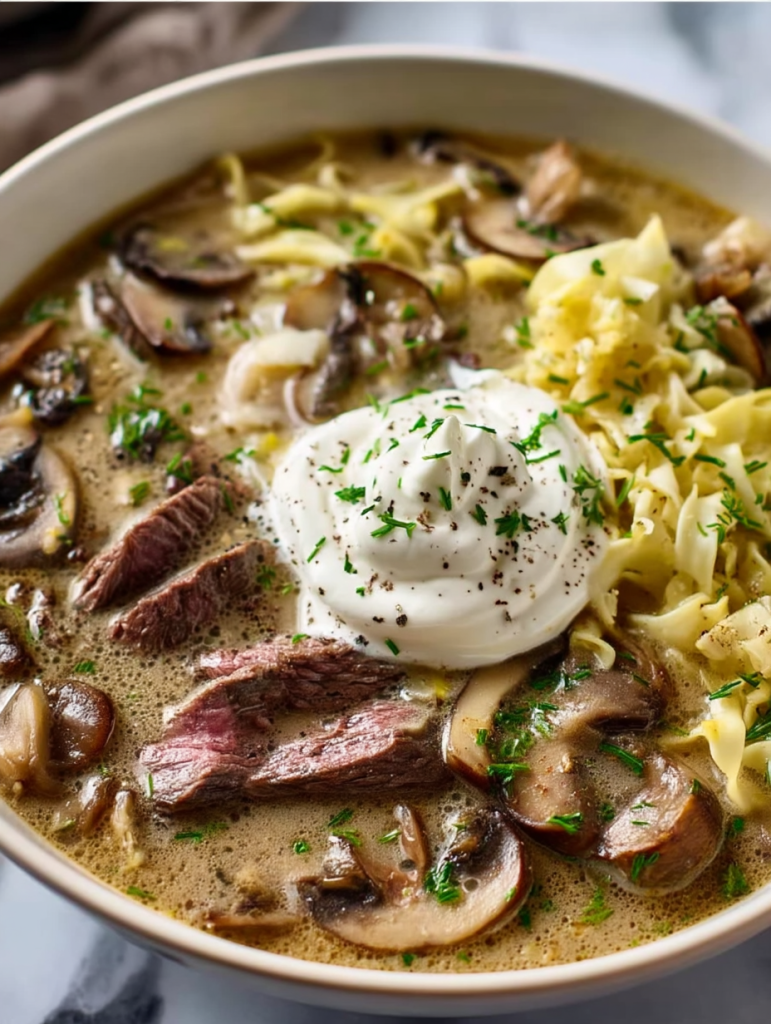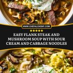 If you’re craving something warm, creamy, and absolutely satisfying, this Easy Flank Steak and Mushroom Soup with Sour Cream and Cabbage Noodles delivers comfort in every spoonful. Tender strips of perfectly seared flank steak soak up a velvety mushroom broth, infused with garlic, onions, and herbs. Topped with a generous dollop of sour cream and a nest of buttery cabbage noodles, it’s the kind of bowl you want to curl up with.