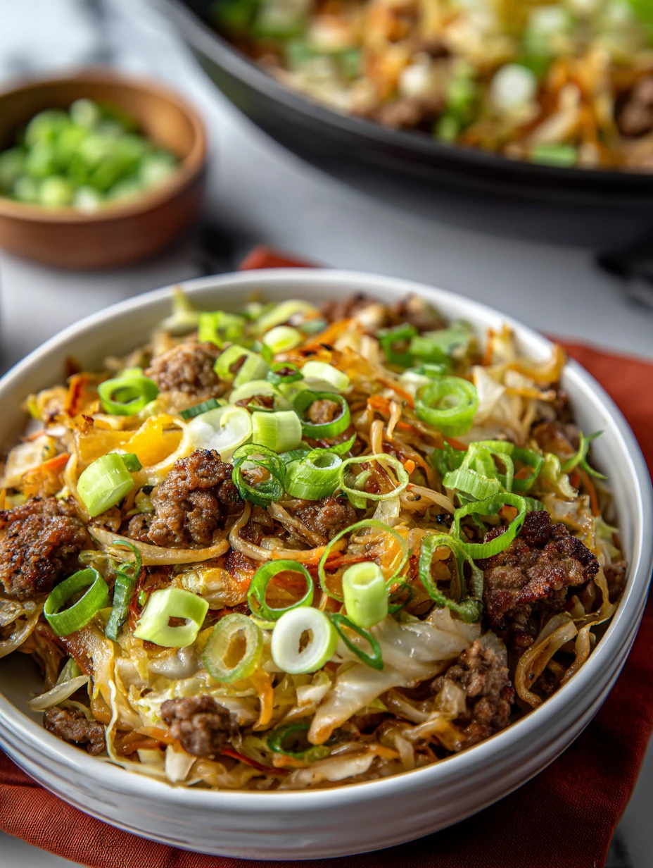 Egg Roll in a Bowl is at its best right out of the pan, when the cabbage is hot and the edges are still a little caramelized. Serve it in warm bowls, topped with extra green onions, sesame seeds, and a drizzle of sriracha or chili oil for those who like more heat. You can also add a squeeze of lime for a bit of brightness.
