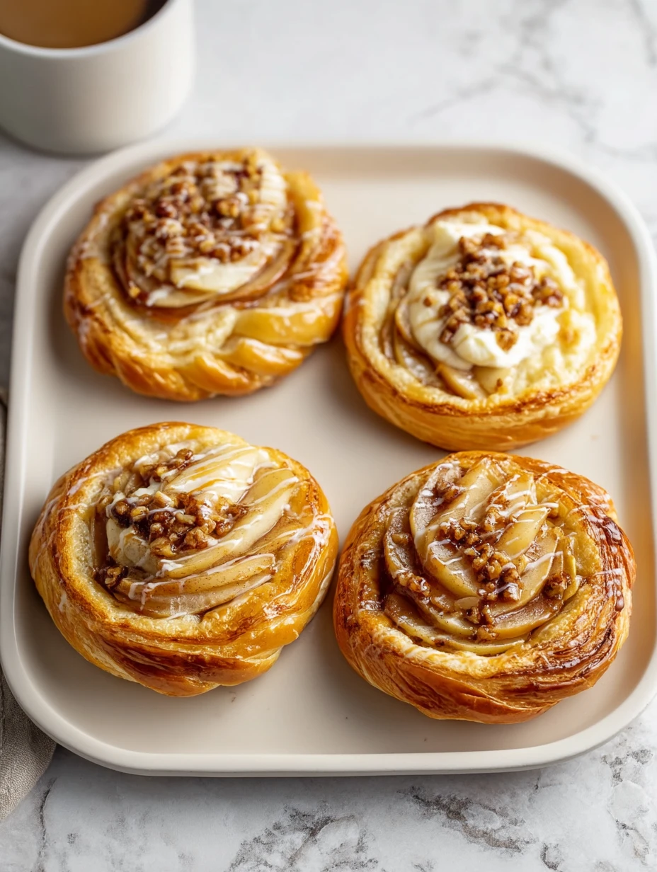 Serve the danishes warm or at room temperature for best texture. They pair wonderfully with a cup of black coffee or chai tea. If making ahead, store leftovers in an airtight container in the fridge for up to 3 days. Reheat briefly in a 300°F oven to bring back the crispiness.
