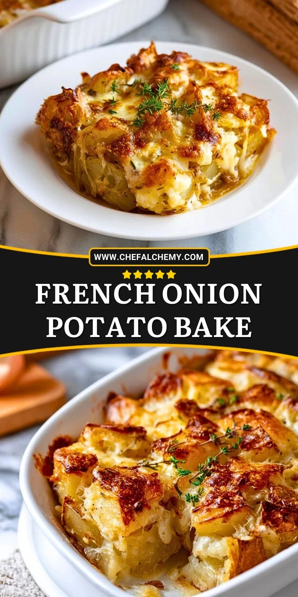 Keywords: french onion potato bake, cheesy potato bake, easy dinner side, comfort food, holiday casserole