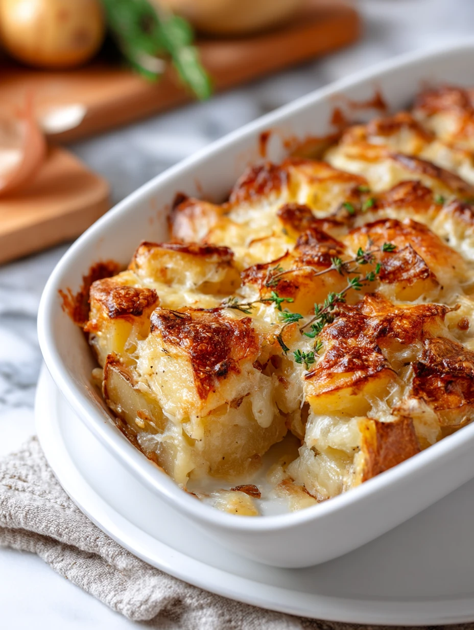 Inspired by the flavors of classic French onion soup, this potato bake uses simple ingredients to achieve extraordinary taste. The combination of crispy edges and gooey cheese makes it a standout dish for holidays or everyday meals.