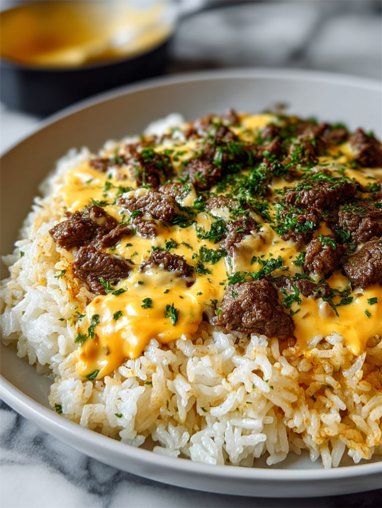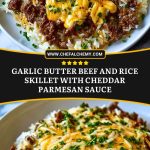 Garlic Butter Beef and Rice Skillet with Cheddar Parmesan Sauce