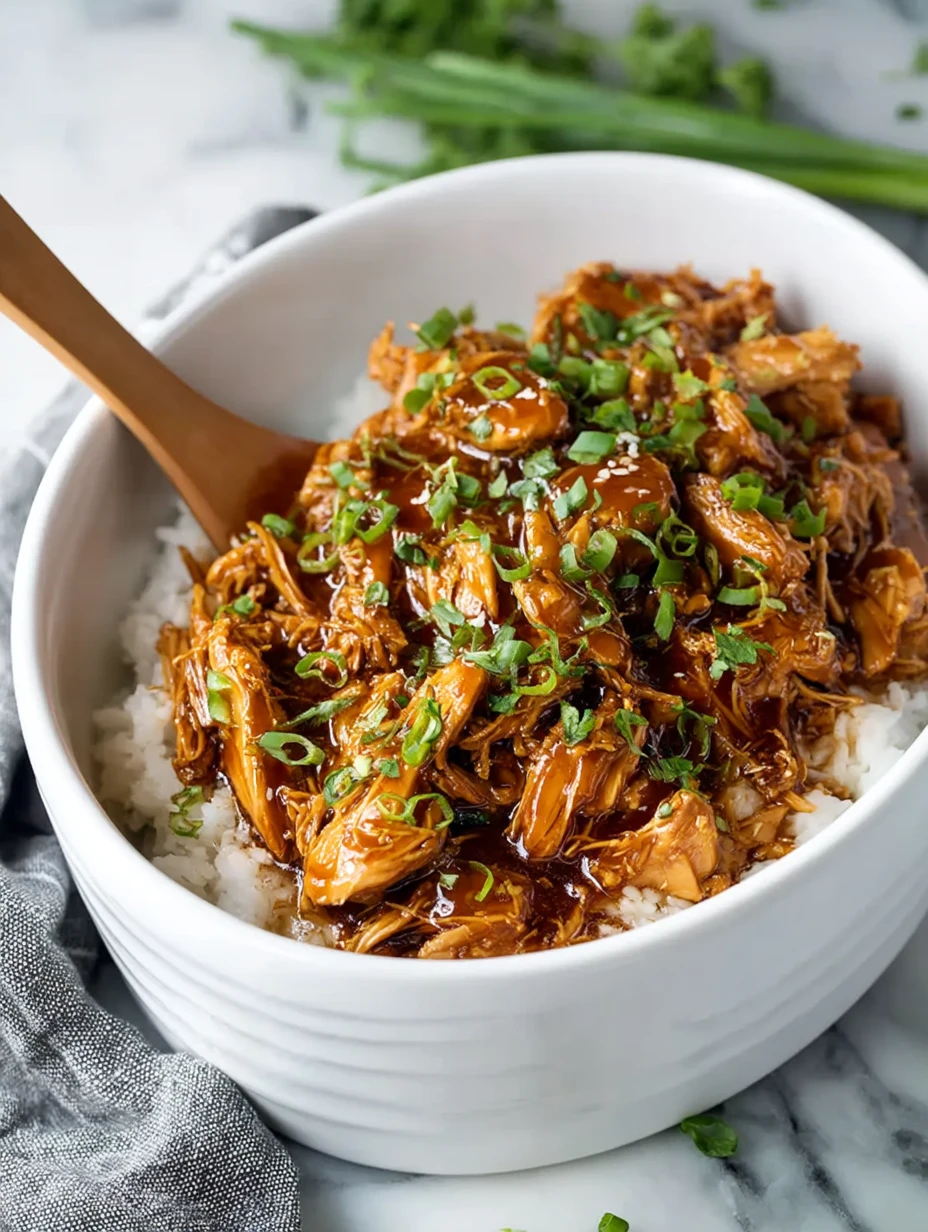 Return shredded chicken to the slow cooker and stir to coat with the thickened sauce. Sprinkle chopped green onions over the top before serving.