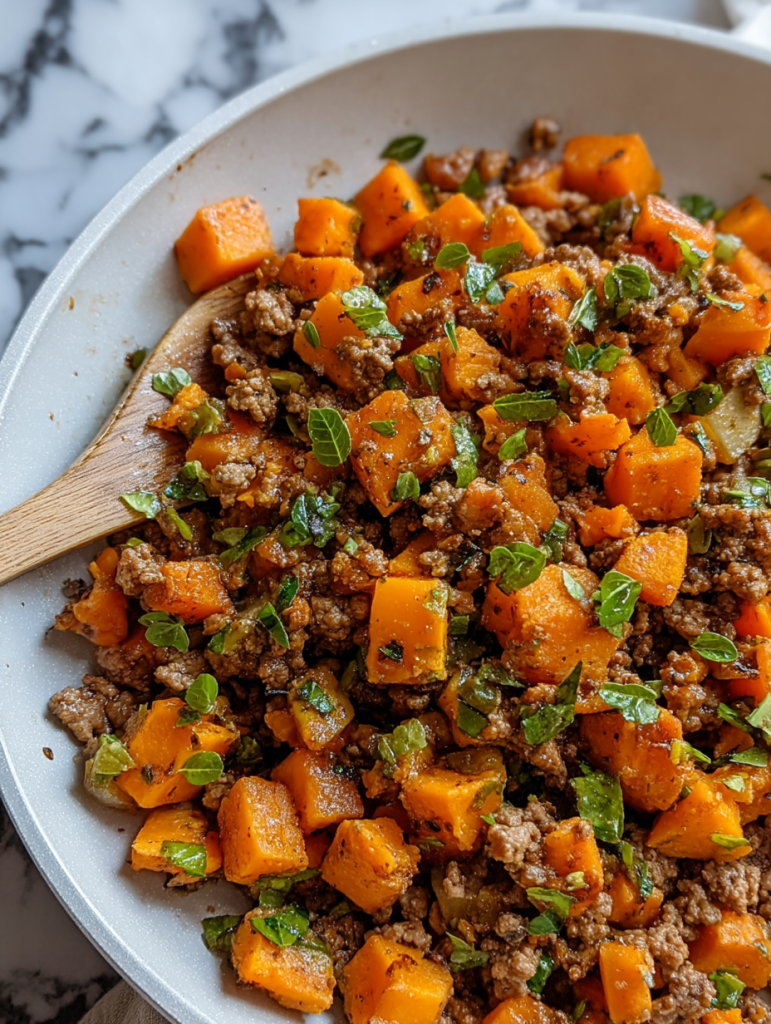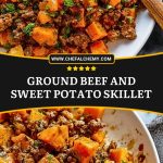 For this recipe, orange-fleshed sweet potatoes (often labeled as “garnet” or “jewel” yams in U.S. grocery stores) work best. They become beautifully tender and slightly caramelized in the skillet, pairing perfectly with savory ground beef. Try to avoid white or purple sweet potatoes for this dish, as they have a firmer, drier texture.
