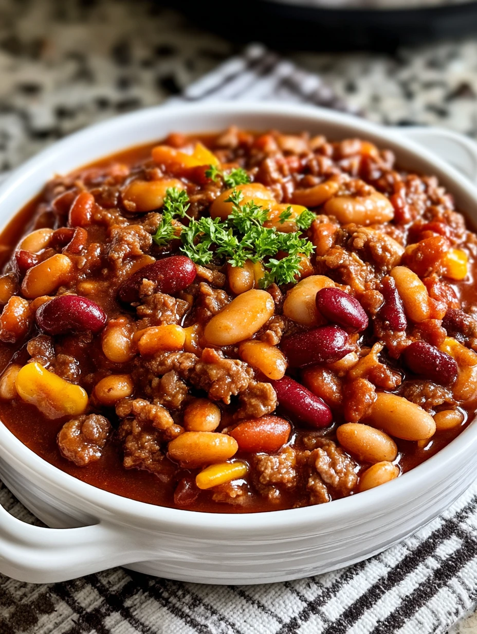 Slow cooking transforms simple pantry staples into something unforgettable. A rich, smoky tomato base surrounds tender beans, seasoned ground beef, and pops of sweet bell peppers. It’s a no-fuss, set-it-and-forget-it dish that fills your kitchen with the mouthwatering aroma of home-cooked goodness.