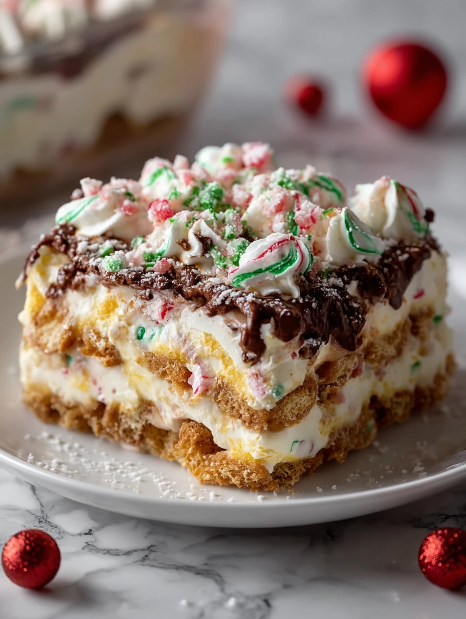 I built this Homemade Christmas Cookie Lasagna for a holiday party when I couldn’t decide between cookies, cheesecake, or pudding—and everyone went back for seconds before the ham was even carved. Imagine layers of buttery golden cookies, fluffy peppermint‑kissed cream cheese filling, and silky vanilla pudding, all buried under clouds of whipped topping and a blizzard of crushed candy canes and red‑and‑green candies.