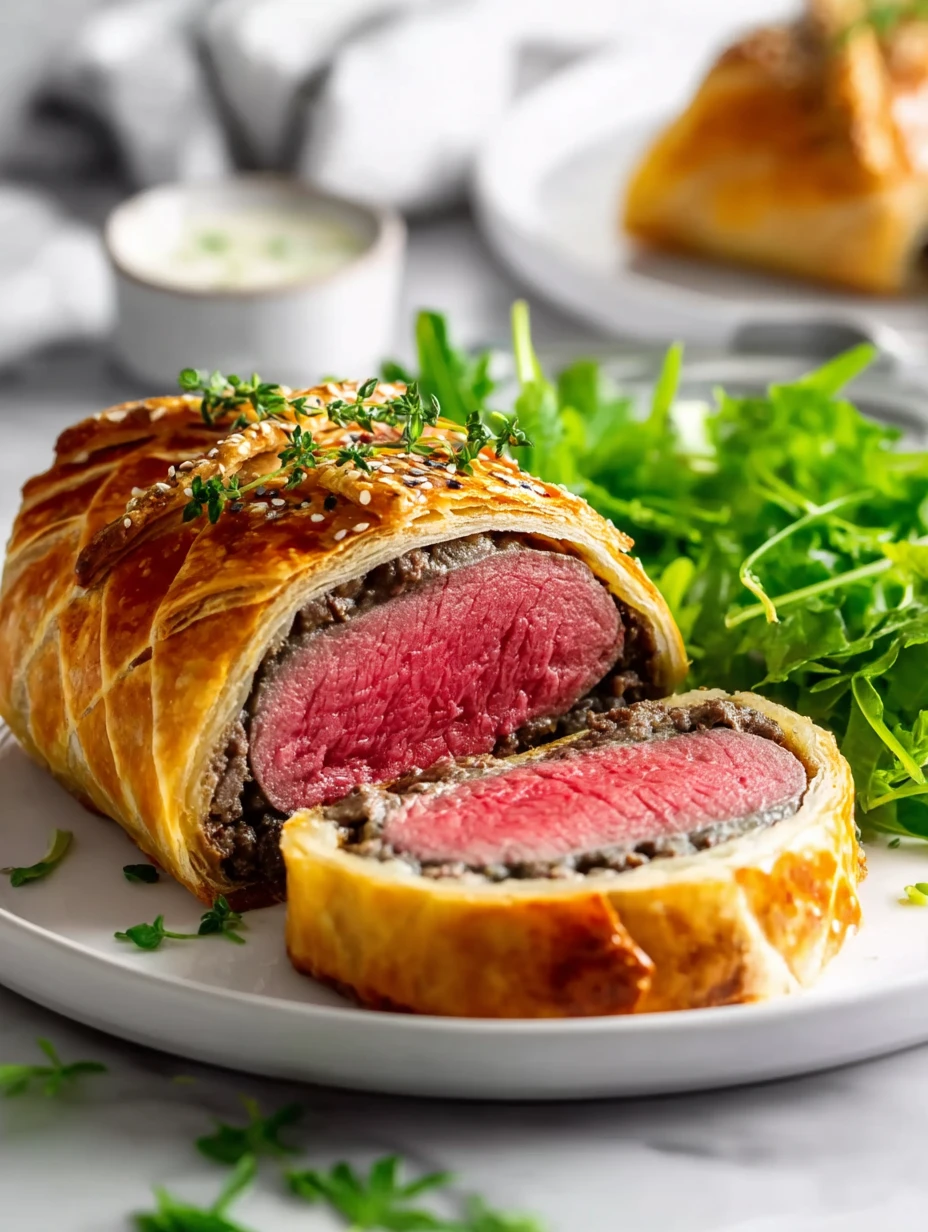 Slice the Beef Wellington with a sharp serrated knife to preserve its structure. Serve immediately to enjoy the contrast between the flaky crust and juicy interior. If you have leftovers, wrap slices in foil and reheat in a low oven to maintain the crust’s texture. Avoid microwaving, as it can make the pastry soggy.
