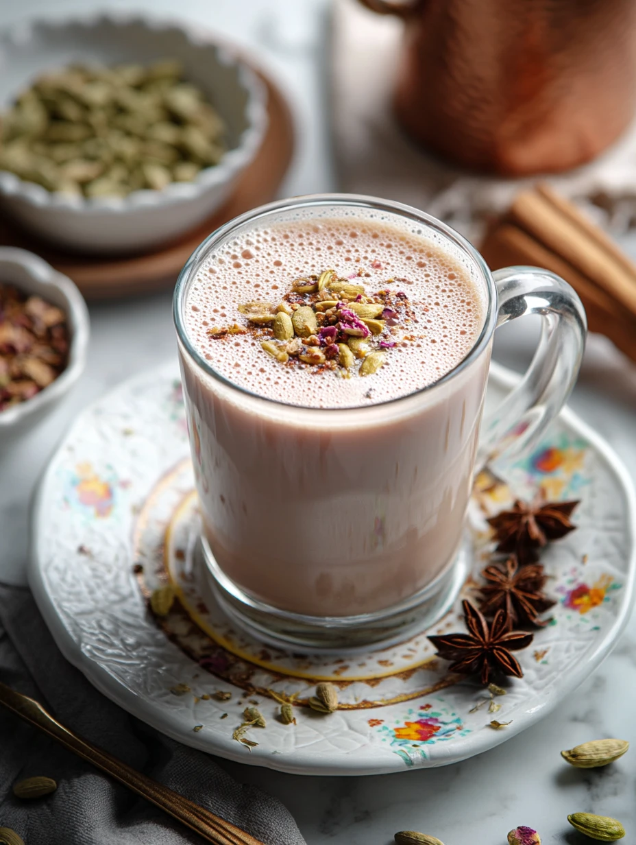 I like serving Kashmiri Pink Chai in clear glass cups when I want to show off the color, but it is just as lovely in a small mug. A sprinkle of chopped nuts on top makes it feel complete, and a little extra cardamom can make the aroma even more inviting.