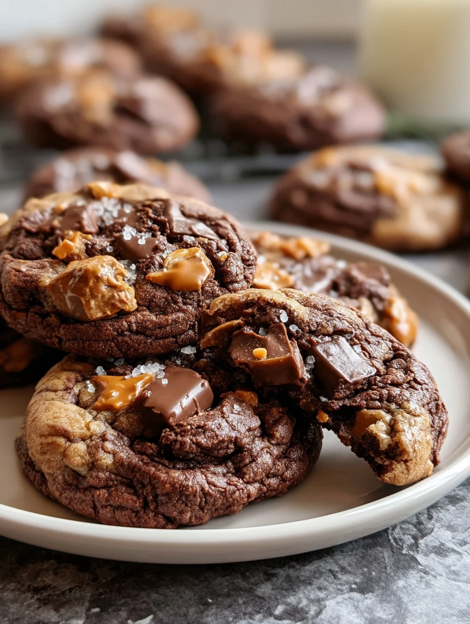 As soon as the cookies come out of the oven, sprinkle them with flaky sea salt. Let them cool on the baking sheets for at least 10–15 minutes so the centers can finish setting. If you break one open too soon, you’ll get molten chocolate and toffee everywhere (which honestly isn’t the worst problem to have).