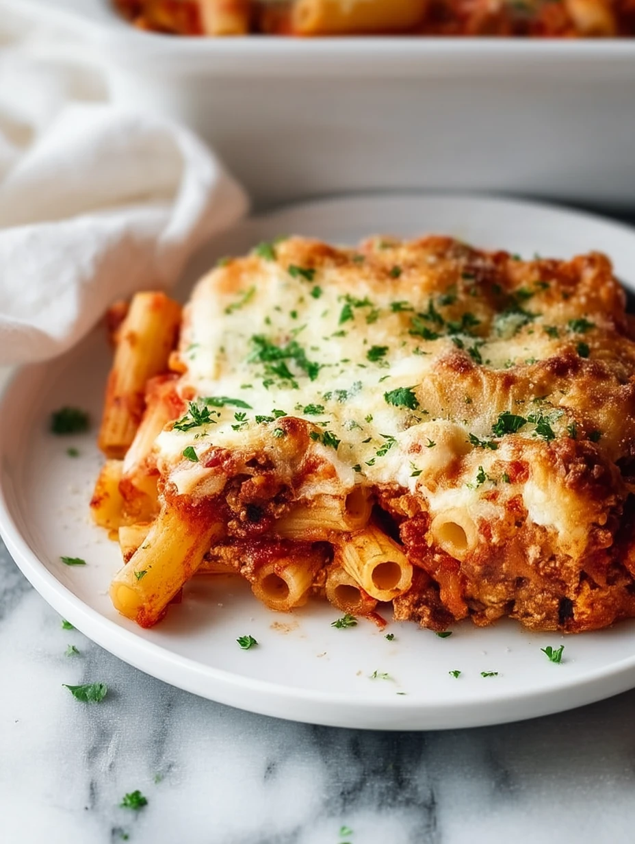 Ziti pasta is traditionally used because of its sturdy shape and ridges that hold onto the sauce perfectly. However, penne or rigatoni also work well if ziti isn’t available. The key is to use a tubular pasta that stands up to baking and holds sauces beautifully.