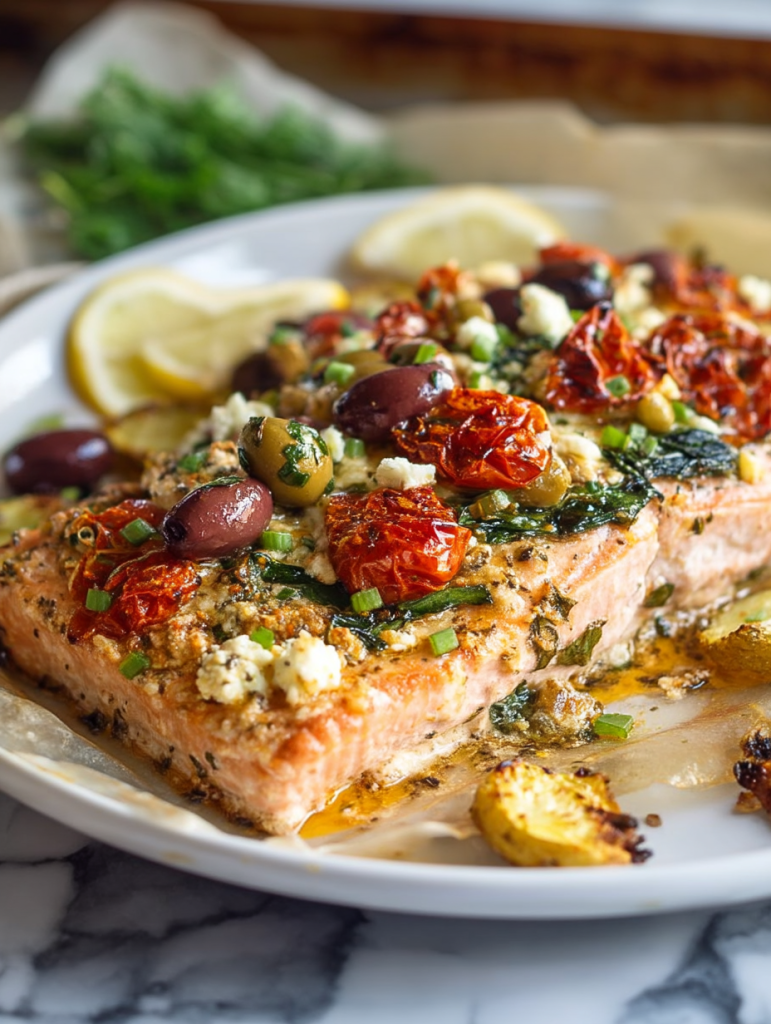 Top the salmon with a handful of baby spinach, followed by chopped sun-dried tomatoes, thin slices of red onion, and minced garlic. Sprinkle crumbled feta generously over the top.