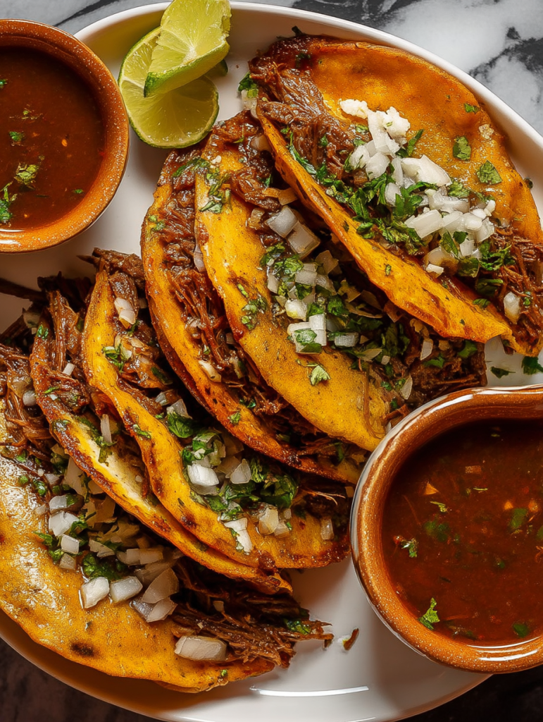 Serve your birria tacos straight off the skillet while the cheese is gooey and the edges are crisp. They pair perfectly with a bowl of hot consommé for dipping. For leftovers, store the beef separately from the tortillas in the fridge. Reheat the meat in the consommé and re-crisp tortillas in a skillet before assembling. They freeze well too—just portion the beef in freezer bags and thaw as needed for a quick flavor-packed dinner.