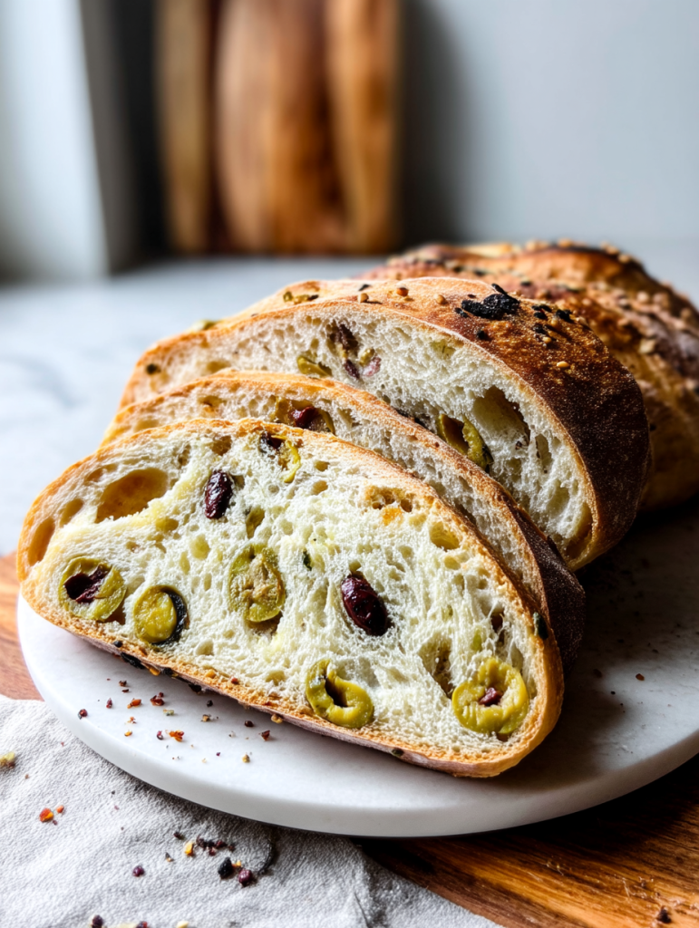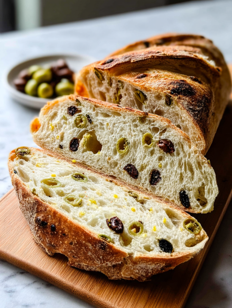 You can mix and match olives depending on what you love most. Green Castelvetrano olives bring a mellow, buttery sweetness, while Kalamata or black olives contribute a deep, briny richness. Use pitted olives for ease, and give them a rough chop before folding them into the dough. The key is to keep them evenly distributed for that beautiful cross-section in every slice.