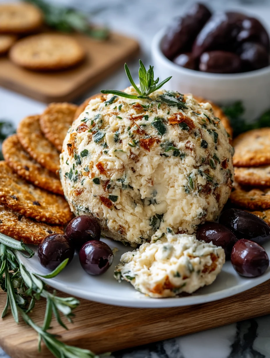 Keywords: cheese ball, holiday appetizer, quick party snack, easy cheese spread, olive appetizer