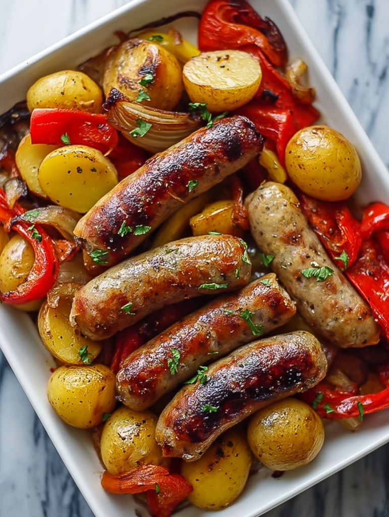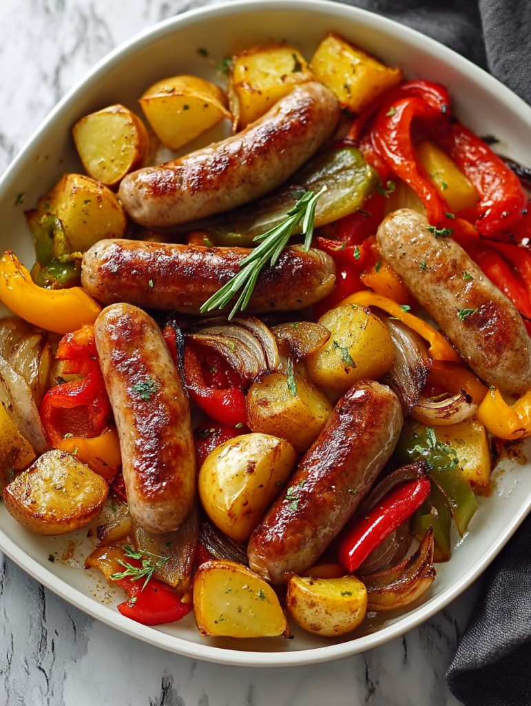 Preheat your oven to 425°F (220°C). On a large rimmed baking sheet, toss the potatoes, peppers, onions, and garlic with olive oil, salt, pepper, and fresh herbs. Nestle the sausages on top so they roast evenly and soak up flavor from underneath.