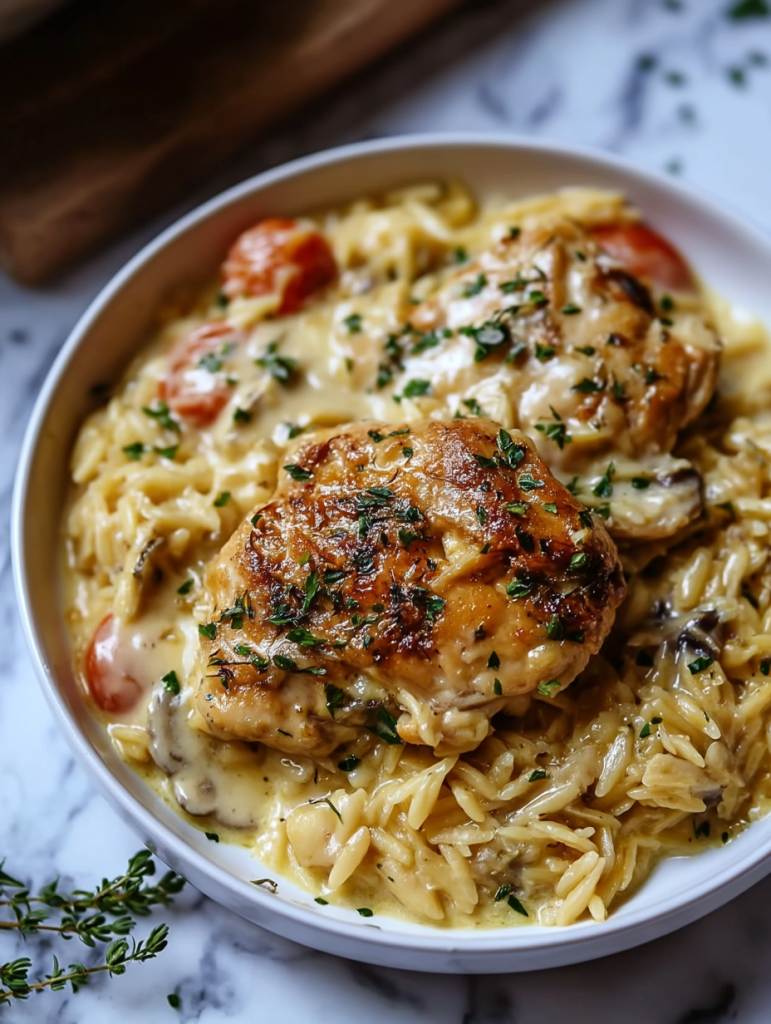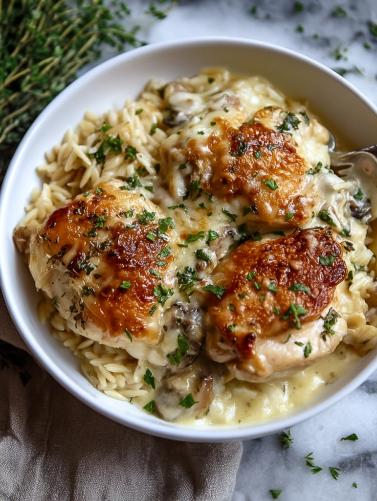 Imagine golden-seared chicken thighs nestled in a bed of creamy orzo, laced with earthy mushrooms and melted Gruyere cheese. One bite in, and you’re wrapped in cozy comfort food bliss. This one-skillet wonder is a weeknight hero, delivering restaurant-quality flavor with minimal cleanup and maximum flavor.