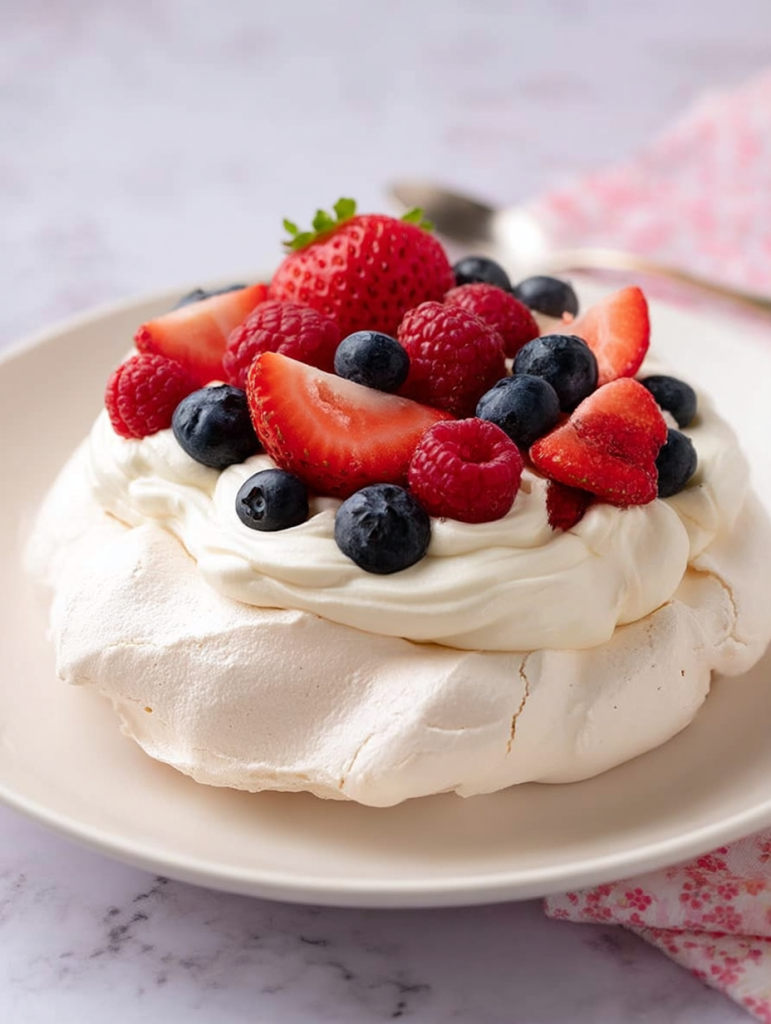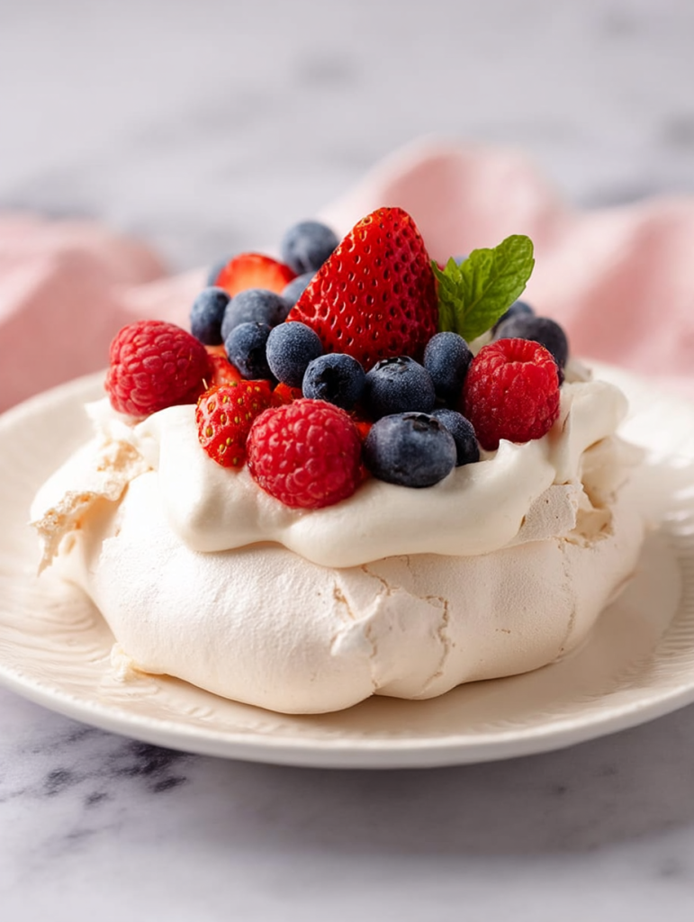 The classic Pavlova uses a French-style meringue made by whipping egg whites with sugar until they form glossy peaks. The trick is adding a touch of cornstarch and vinegar—this stabilizes the structure and helps achieve that perfect contrast of crispy shell and soft center. Make sure your bowl is clean and grease-free, and always beat the whites slowly at first before increasing speed.